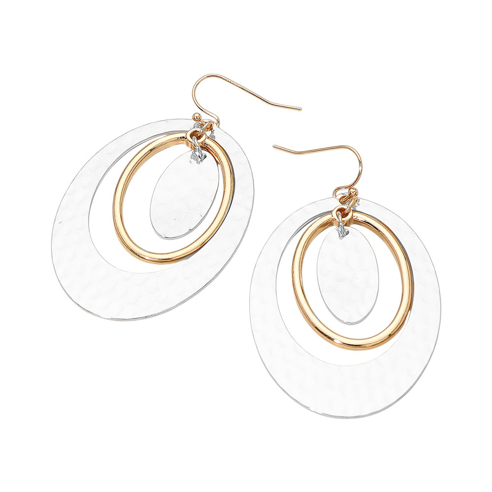Details • Size : 1.4" X 2.25" • Fish Hook Back • Elevate your accessory game with these textured oval layered dangle earrings. Featuring interlocking open ovals with a subtle hammered finish, they blend modern sophistication with timeless elegance. Perfect for adding movement and shine to both casual and dressy looks. • Lead and Nickel Compliant