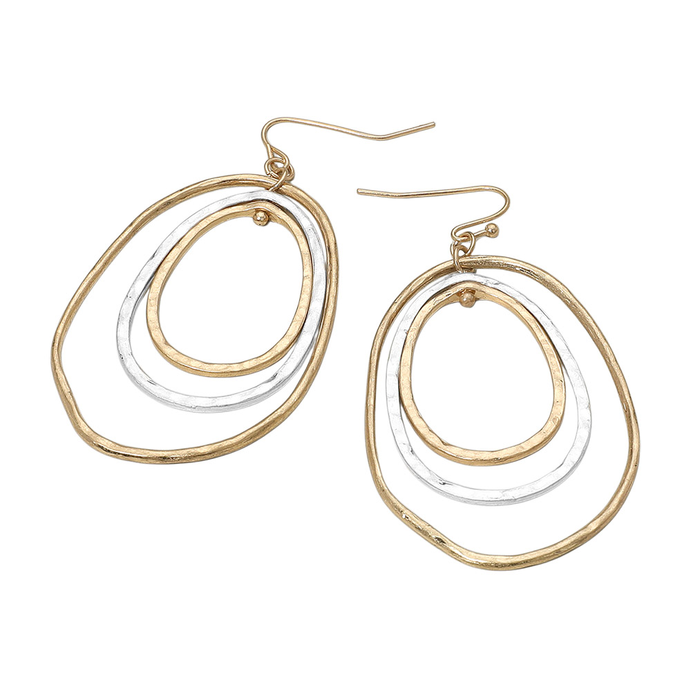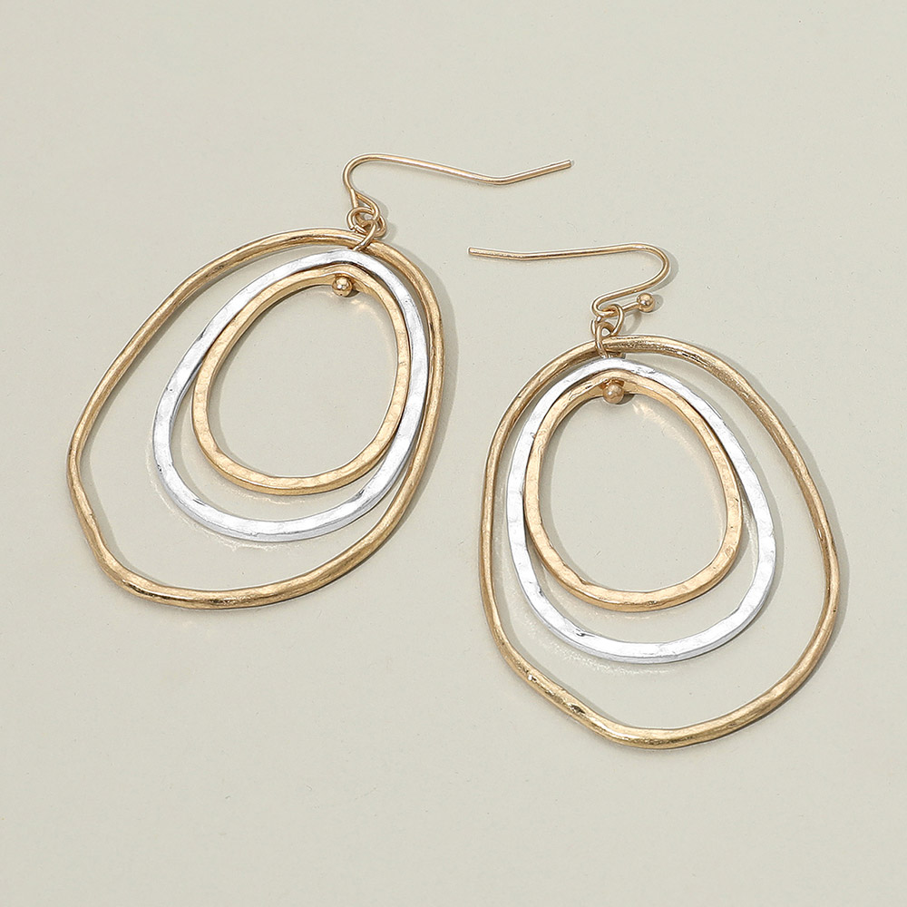 Details • Size : 1.4" X 2.5" • Fish Hook Back • Contemporary layered oval drop earrings featuring an artistic open design. Lightweight and stylish, perfect for adding a touch of elegance to casual or formal outfits. Ideal for everyday wear or gifting. • Lead and Nickel Compliant