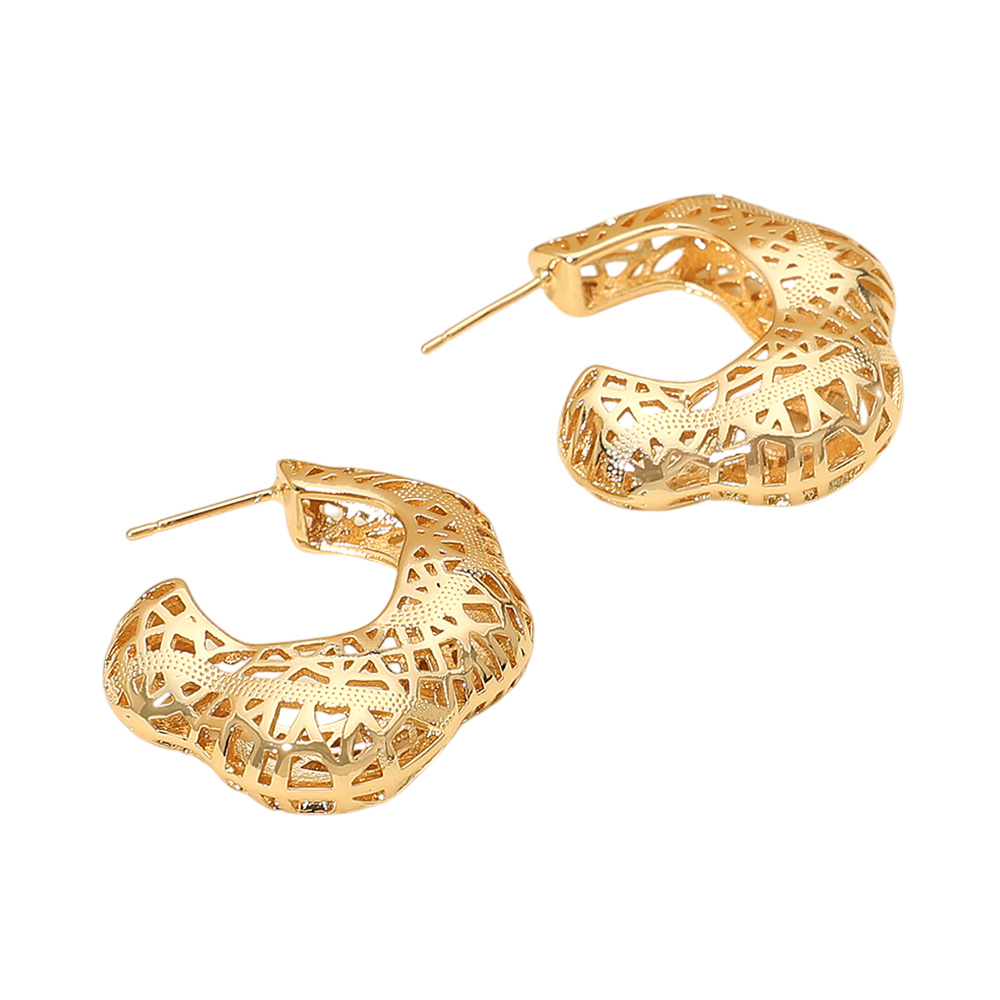 Details • Size : 1.4" X 1.25" • Post Back • Make a bold statement with these cutout chunky hoop earrings. Designed with a stylish hollow pattern and textured shine, these trendy statement hoops are perfect for elevating everyday looks or adding glam to evening outfits. • Lead and Nickel Compliant