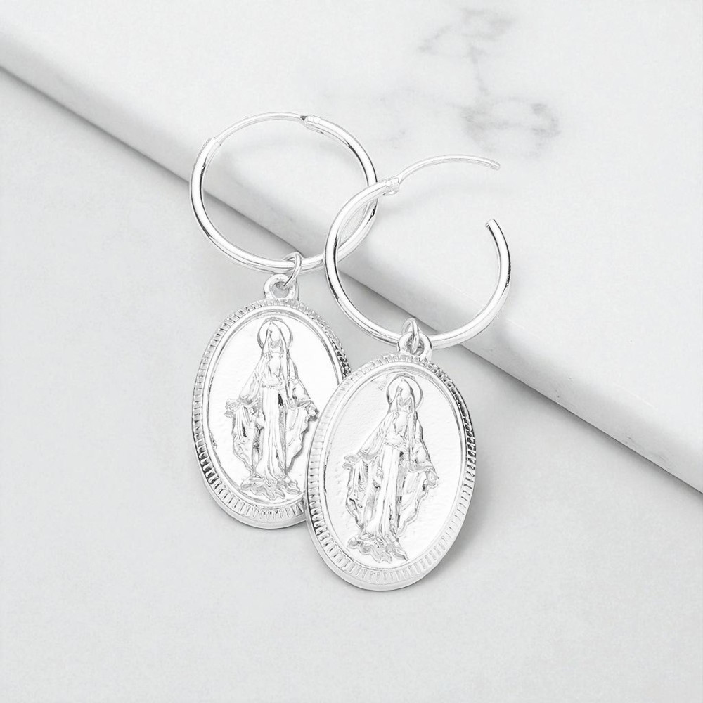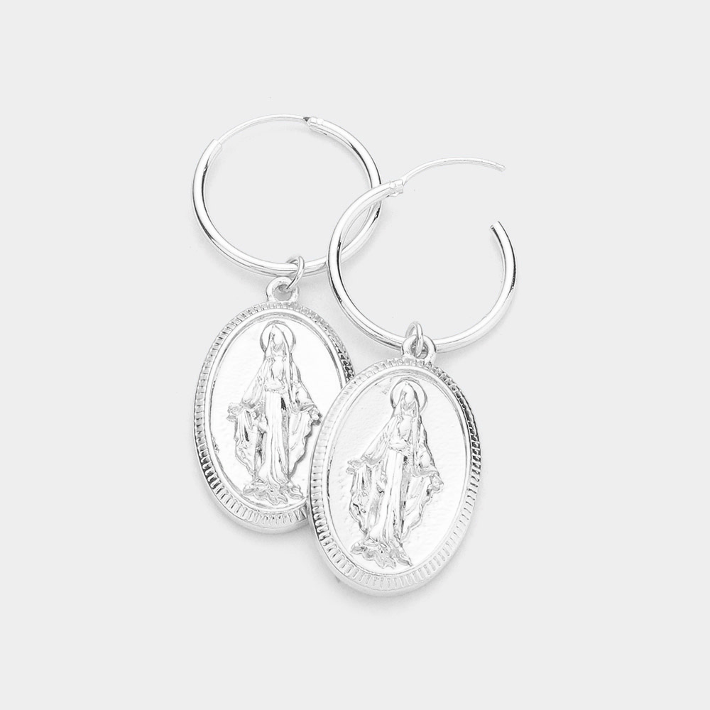 Metal Hoop Virgin Mary Accented Oval Dangle Earrings