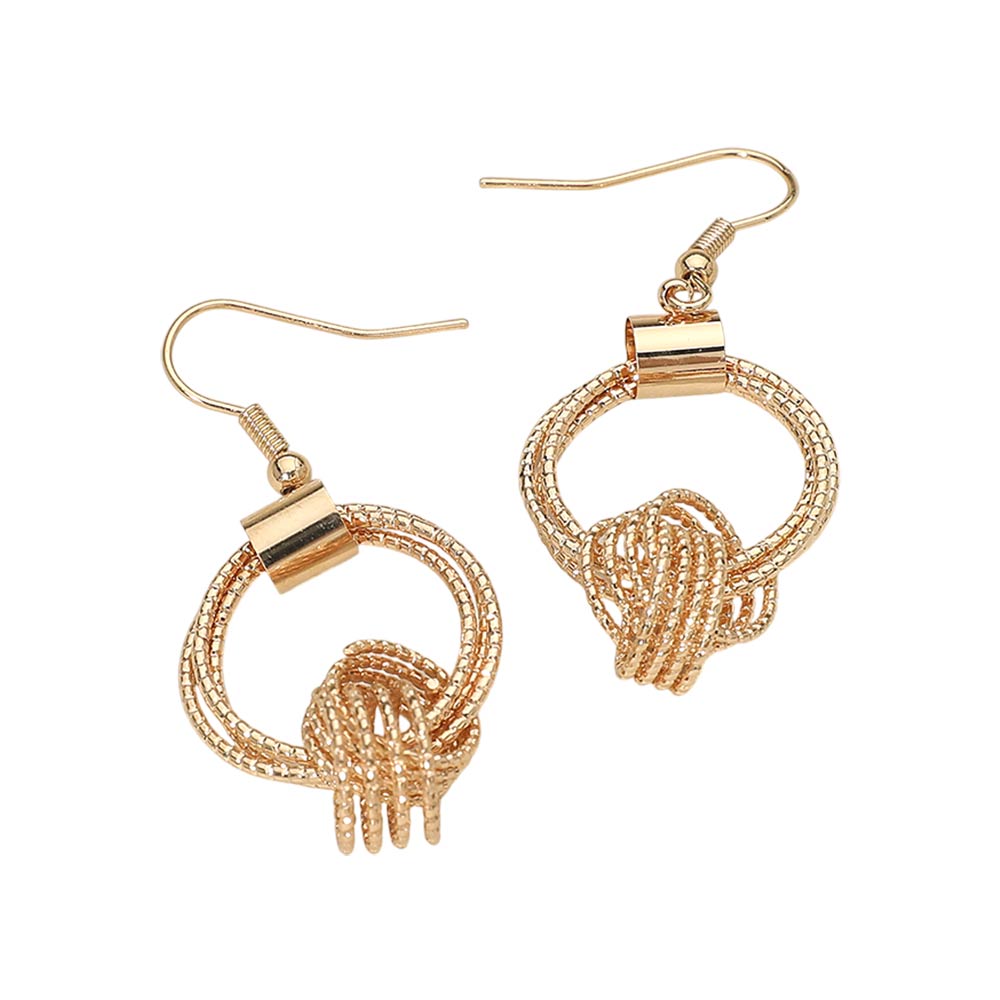 • Add modern texture to your accessory lineup with these knot detail hoop drop earrings. Designed with a layered loop and sculptural knot accent, they bring subtle movement and visual interest to everyday and dressy looks alike. The balanced drop length offers an eye-catching silhouette without feeling heavy, making them easy to wear from daytime styling to evening occasions. A versatile choice for gifting, seasonal assortments, and trend-focused collections.