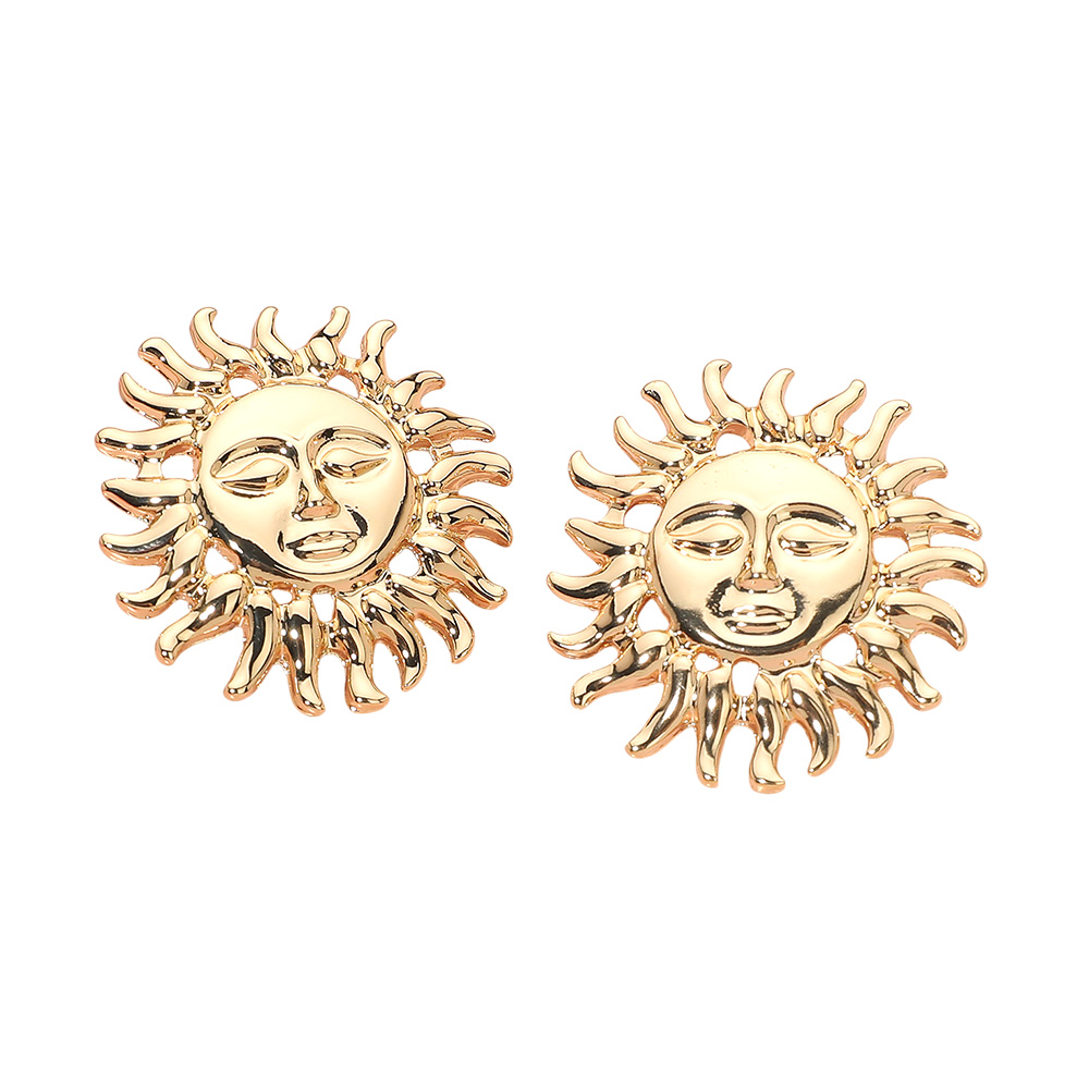 Details • Size : 1.6" X 1.6" • Post Back • Unique sun face stud earrings featuring a radiant burst design with detailed facial accents. Perfect for adding celestial charm and bold artistic flair to casual outfits, parties, or festival looks. • Lead and Nickel Compliant