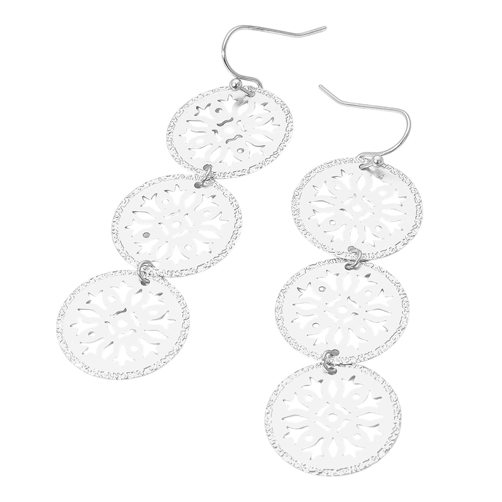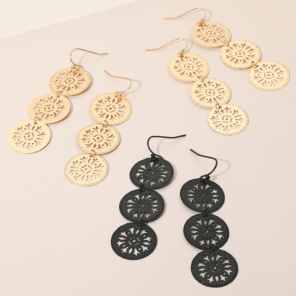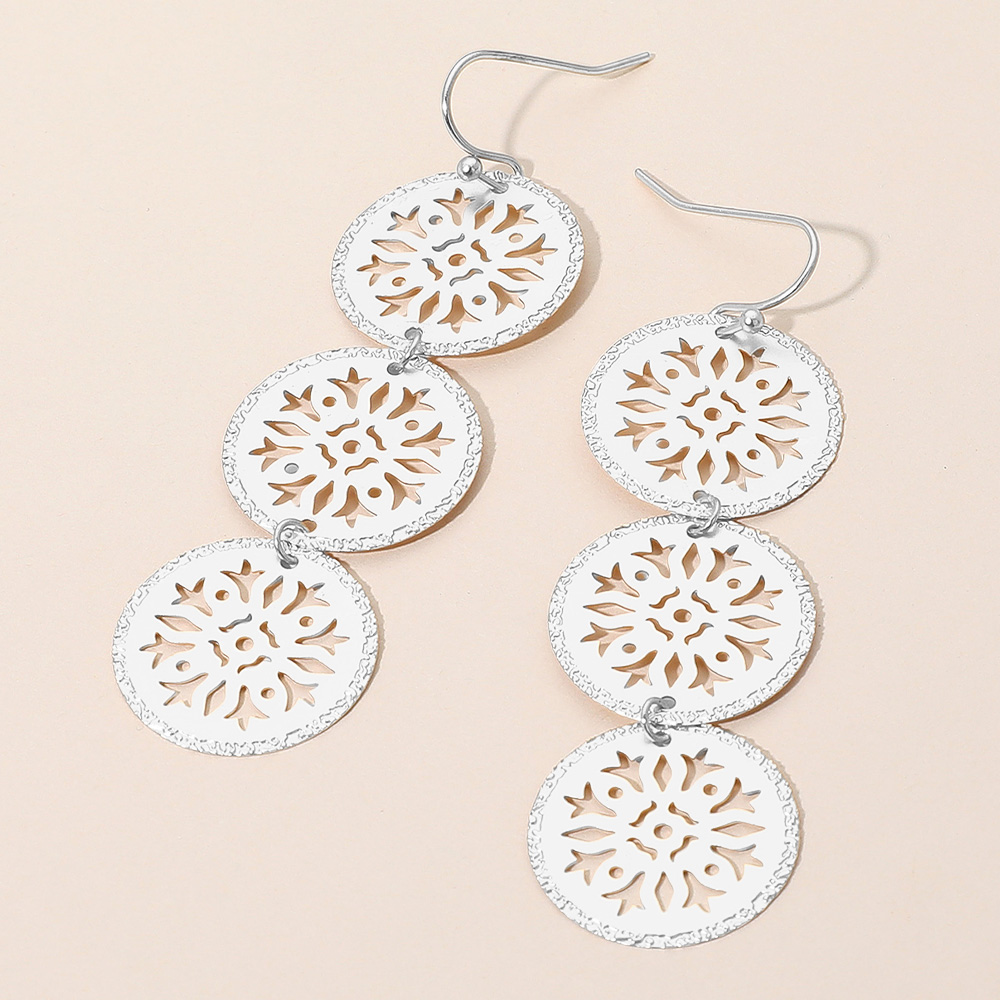Details • Size : 0.8" X 2.7" • Fish Hook Back • Make a bold impression with these triple disc dangle earrings. Featuring an intricate snowflake cutout design, they offer a modern geometric touch perfect for elevating casual and evening outfits. • Lead and Nickel Compliant