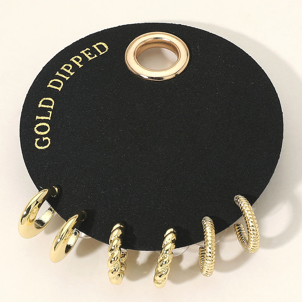 Details • Size : 0.6" L • Post Back • Versatile hoop earring set featuring a variety of smooth and textured designs for effortless everyday styling. Designed to mix and match easily, these hoops add subtle shine and dimension to casual looks, workwear, and special occasions, making them a must-have staple for boutique accessory collections. • Gold Dipped