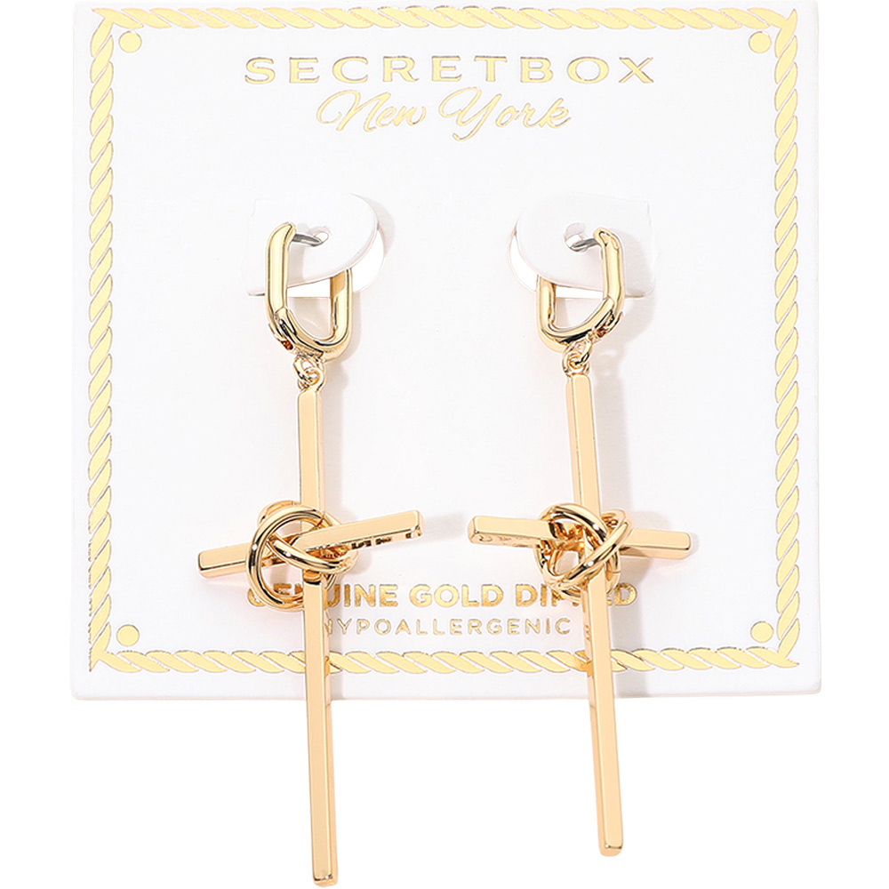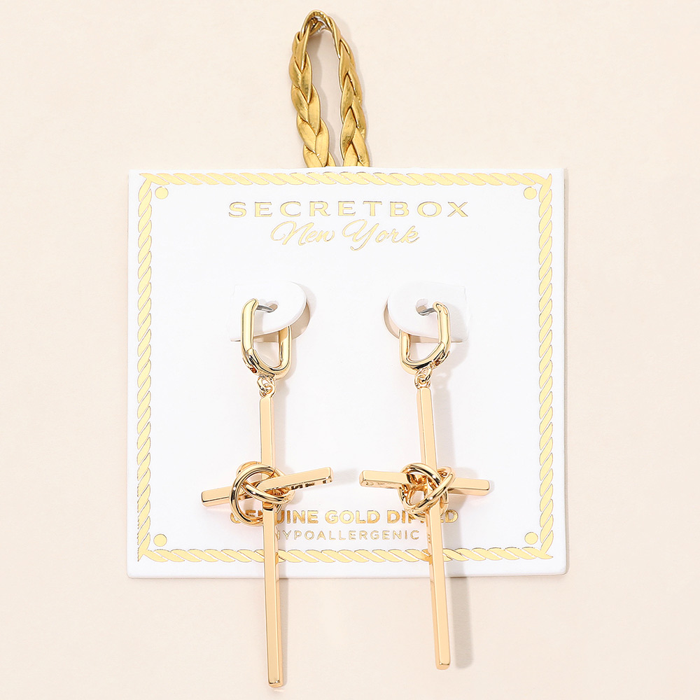 Details • Size : 0.9" X 2.75" • Post Back • Sculptural knot cross bar drop earrings add sleek, eye-catching movement to any outfit. Designed for comfort and everyday wear, they transition effortlessly from casual looks to dressed-up occasions, making a versatile accessory choice or stylish gift option with timeless appeal. • Gold Dipped • Hypoallergenic