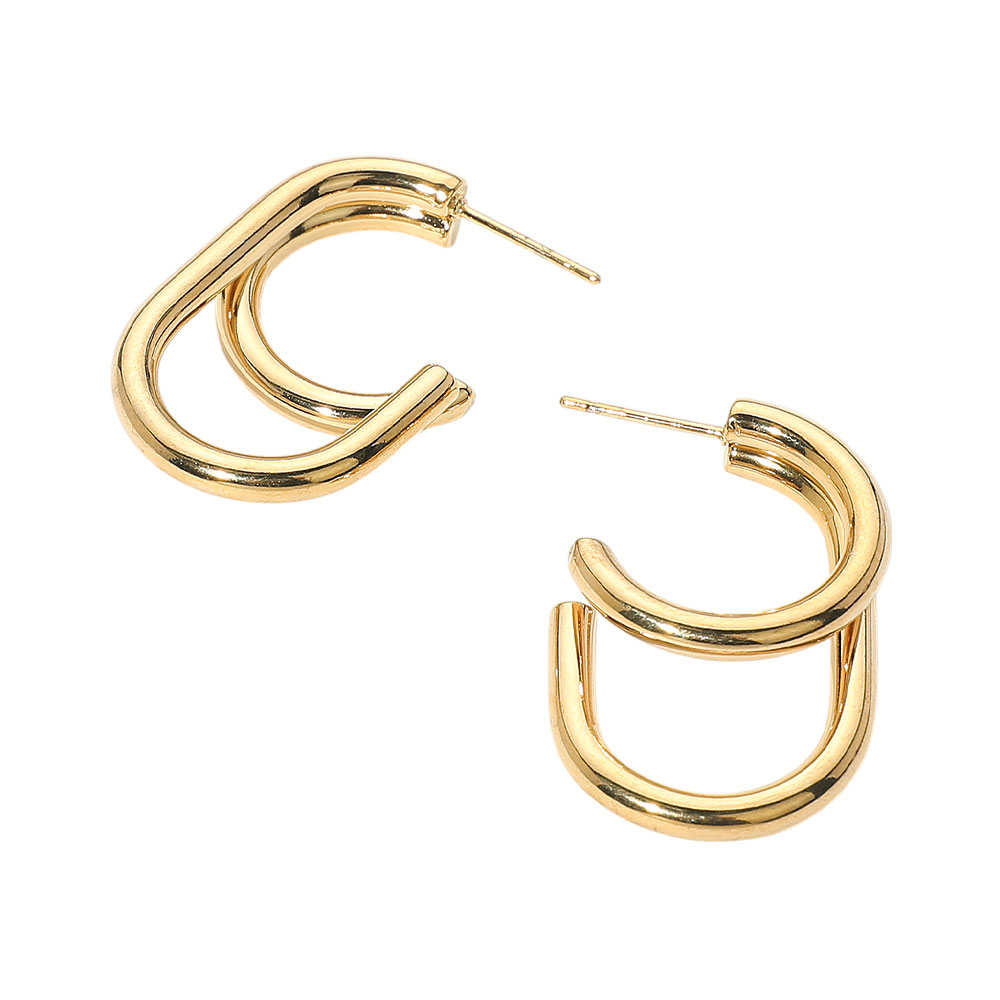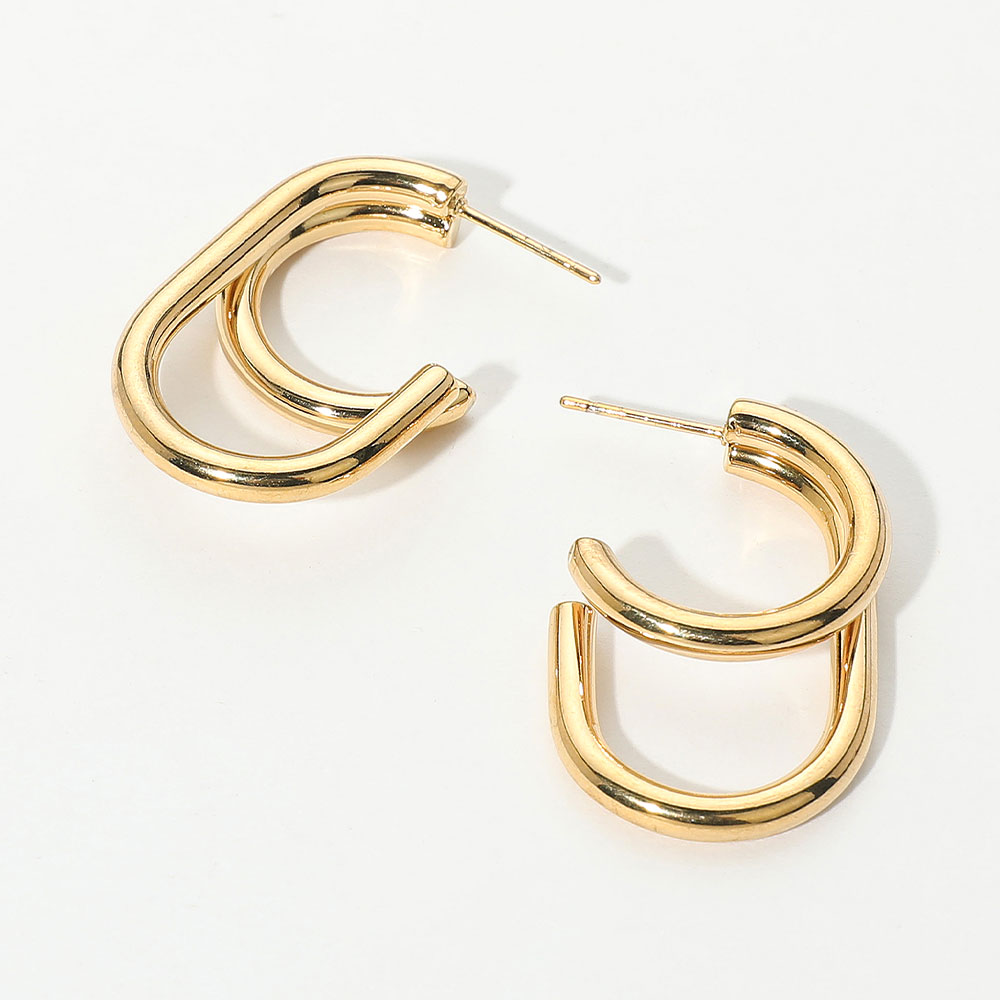 Details • Size : 1" X 1.25" • Post Back • Water Resistant • Stylish layered curve hoop earrings featuring a bold double-band silhouette that adds dimension and modern appeal. Designed to elevate everyday outfits or complement evening looks, these statement hoops offer a clean, versatile style perfect for casual, work, or special occasion wear. • Hypoallergenic • Stainless Steel