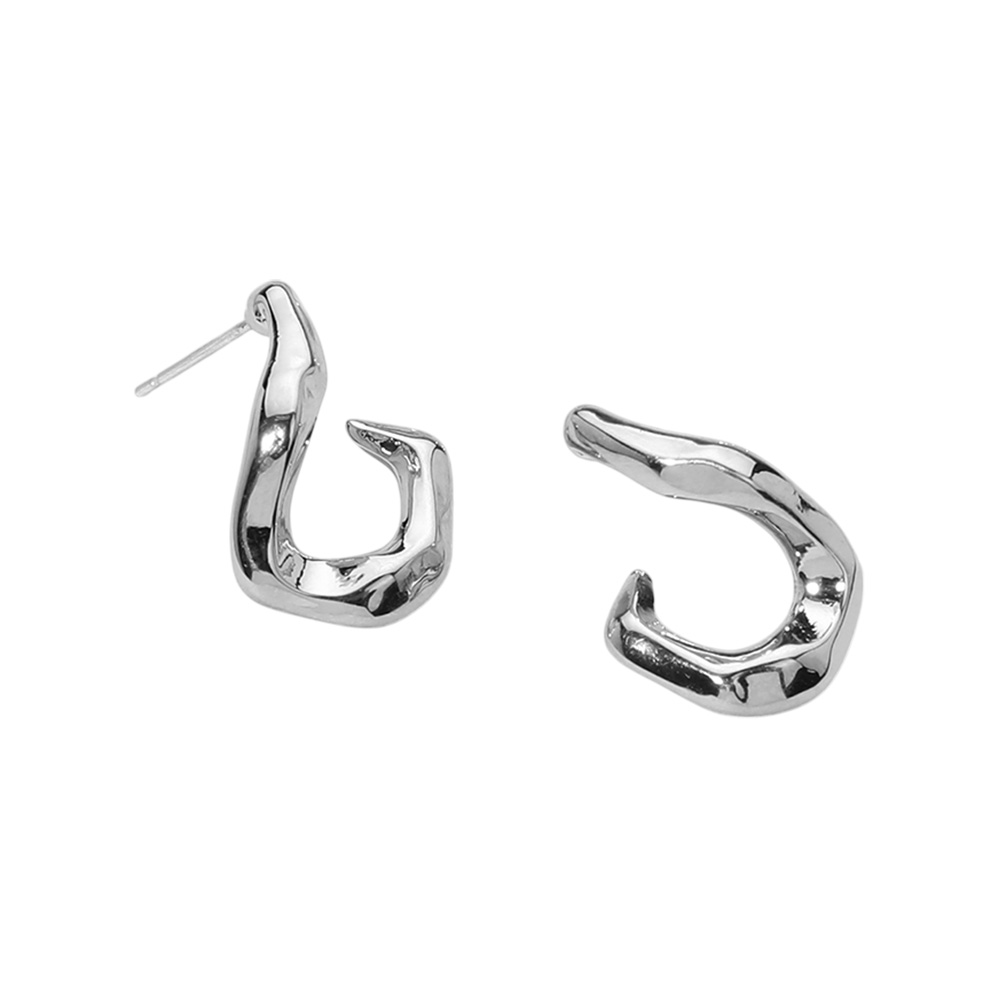 Details • Size : 0.6" X 0.8" • Modern irregular mini hoop earrings featuring a textured abstract design and sterling silver posts. Lightweight and stylish, perfect for everyday wear or gifting. A chic accessory that adds a unique touch to any outfit. • Lead and Nickel Compliant • Made In Korea • Sterling Silver Post • Sterling Silver Dipped