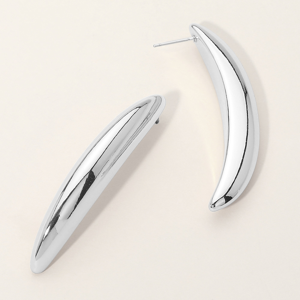 Details • Size : 0.3" X 2.25" • Post Back • Modern curved stud earrings featuring a sleek, sculptural silhouette that adds effortless edge to any look. Designed for everyday wear or elevated styling, these statement studs pair easily with casual outfits, office looks, and evening ensembles while offering a clean, contemporary jewelry aesthetic. • Sterling Silver Dipped • Hypoallergenic • Lead and Nickel Compliant