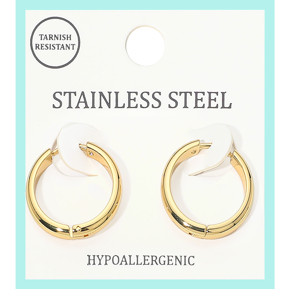 Details • Size : 0.75" X 0.75" • Huggie Back • Tarnish Resistant • Timeless and versatile, these classic hoop earrings are crafted from stainless steel for lasting durability. Hypoallergenic and tarnish-resistant, they are perfect for sensitive skin and everyday wear, offering a sleek, minimalist design that complements both casual and formal outfits effortlessly. • Hypoallergenic • Stainless Steel