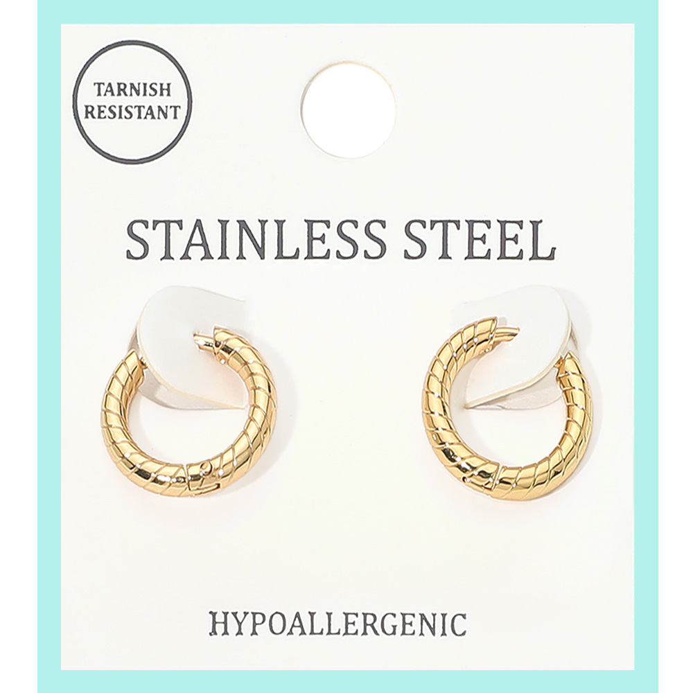 Details • Size : 0.6" X 0.6" • Huggie Back • Tarnish Resistant • These small textured hoop earrings feature a sleek patterned design that blends classic elegance with a modern edge. Perfect for daily wear or evening outfits, they are lightweight, versatile, and timeless, making them an essential addition to any jewelry collection. • Hypoallergenic • Stainless Steel