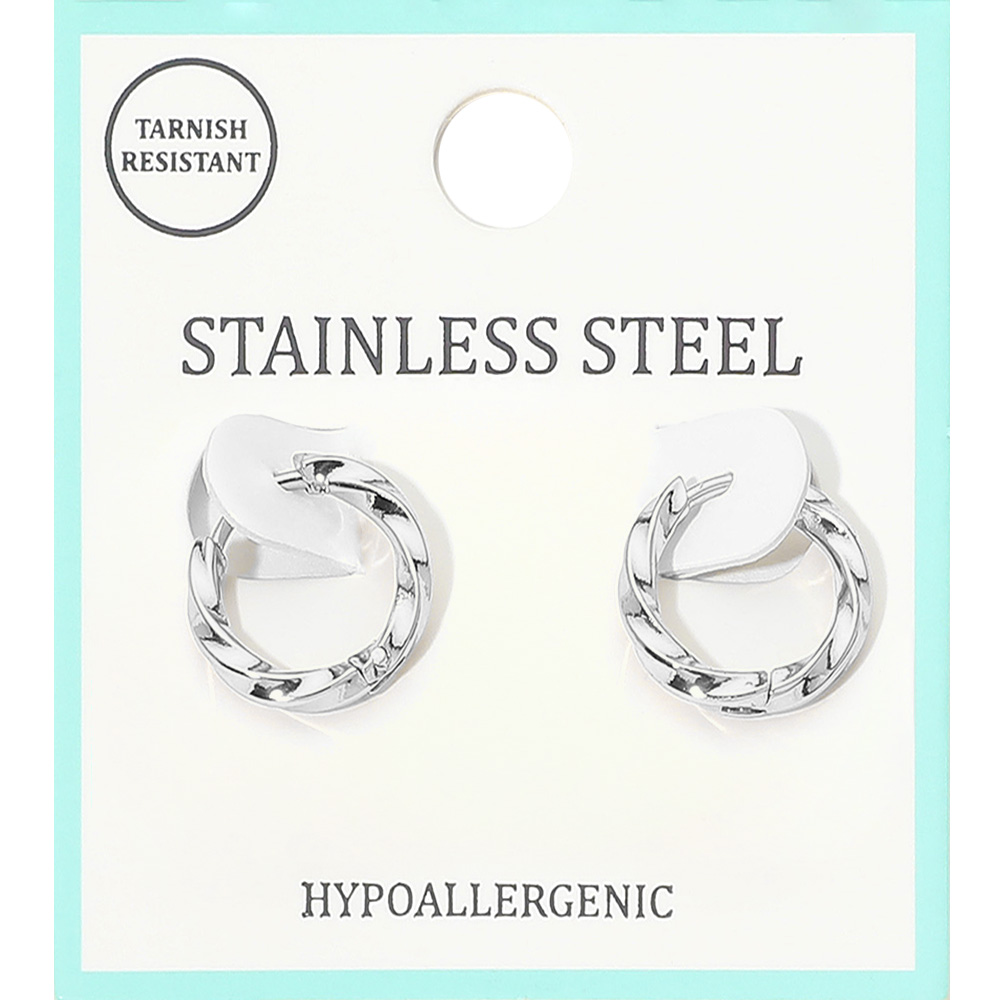 Details • Size : 0.6" X 0.6" • Huggie Back • Tarnish Resistant • These small twisted hoop earrings feature a chic, textured design that adds modern flair to a timeless look. Perfect for casual or formal wear, they are lightweight, versatile, and stylish, making them an essential accessory for effortless everyday fashion. • Hypoallergenic • Stainless Steel