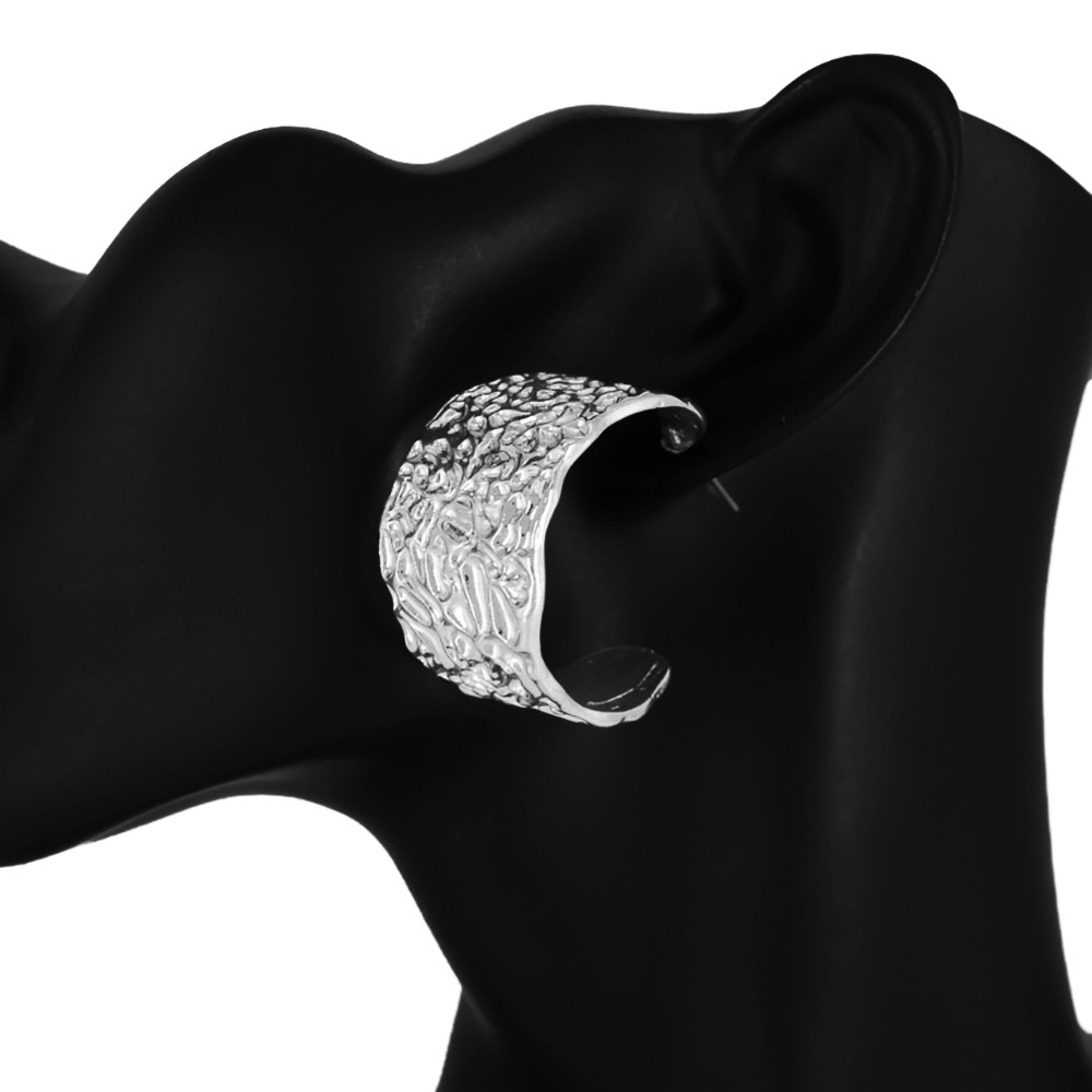 Details • Size : 1" X 1.5" • Post Back • Elegant crescent-shaped hoop earrings with a textured sculpted finish that adds a touch of sophistication. These statement earrings bring a modern artistic look, perfect for enhancing everyday outfits or completing a polished evening ensemble. • Lead and Nickel Compliant