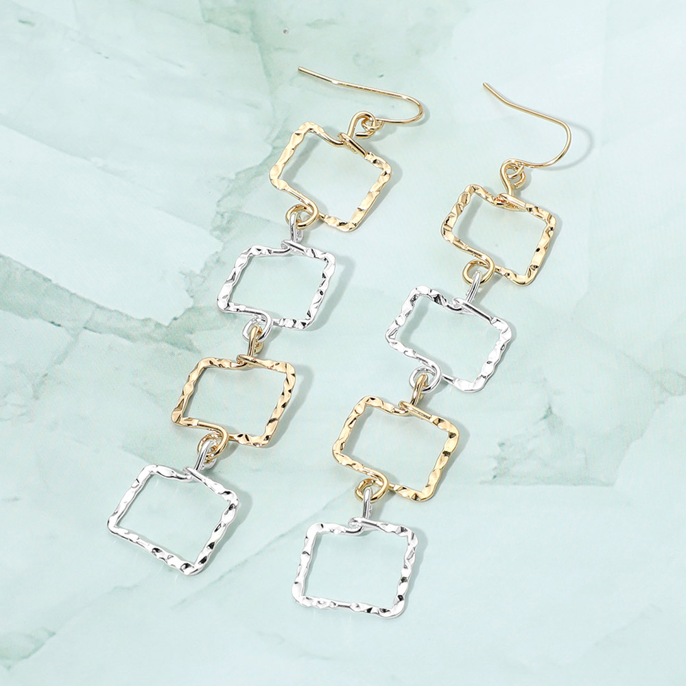 Details • Size : 0.6" X 3.5" • Fish Hook Back • Modern drop earrings featuring a chain of textured square links that create eye-catching movement and a bold yet wearable silhouette. Designed for effortless styling, these earrings transition easily from everyday outfits to evening looks. A versatile, trend-driven accessory perfect for boutiques seeking contemporary statement pieces with a clean, geometric aesthetic. • Lead and Nickel Compliant