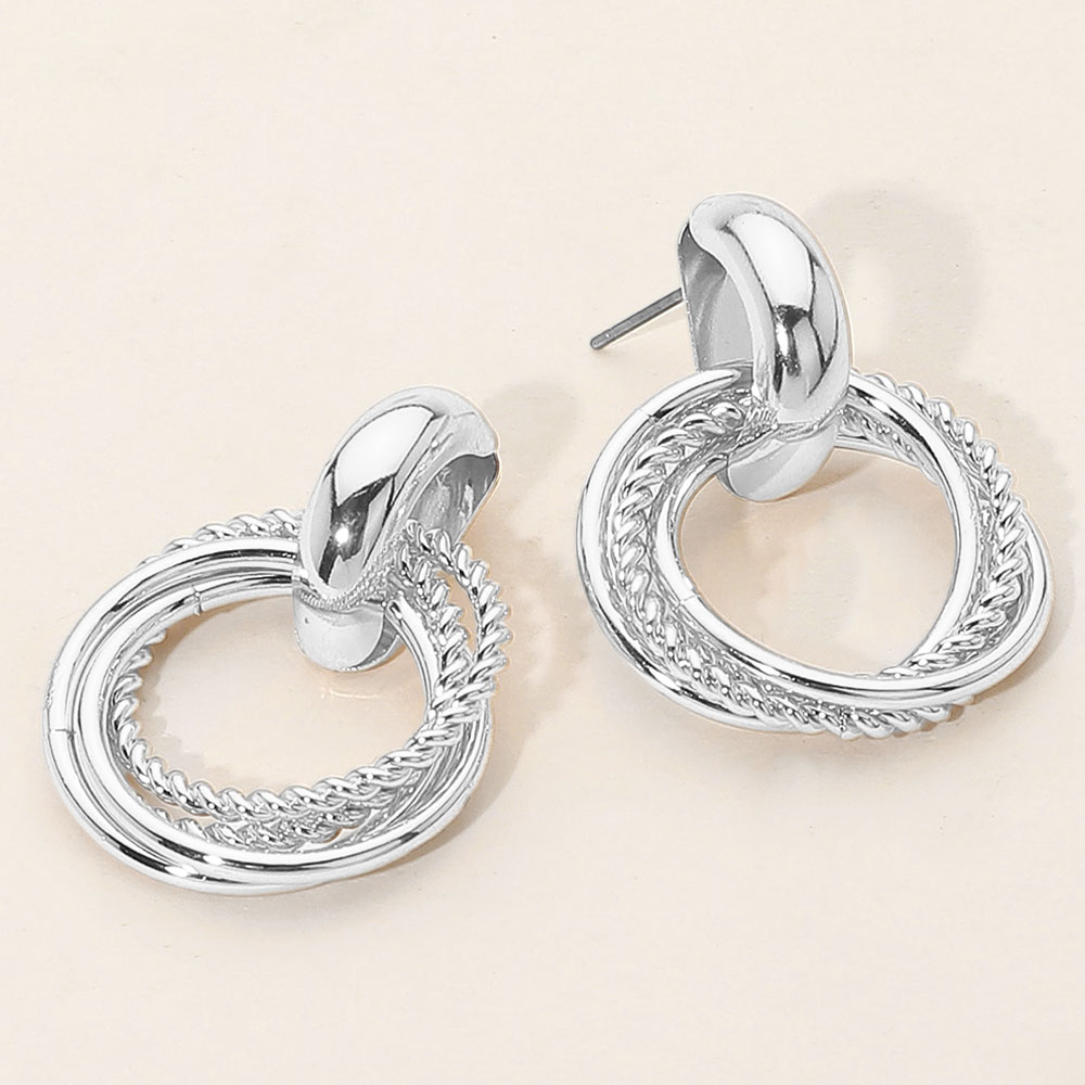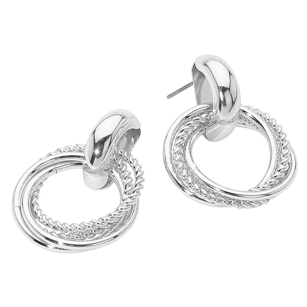 Details • Size : 1" X 1.4" • Post Back • Elegant drop earrings featuring interlocking hoops with a blend of smooth polish and twisted rope textures. A versatile statement accessory, perfect for enhancing both casual and formal outfits with a modern, sophisticated touch. • Lead and Nickel Compliant