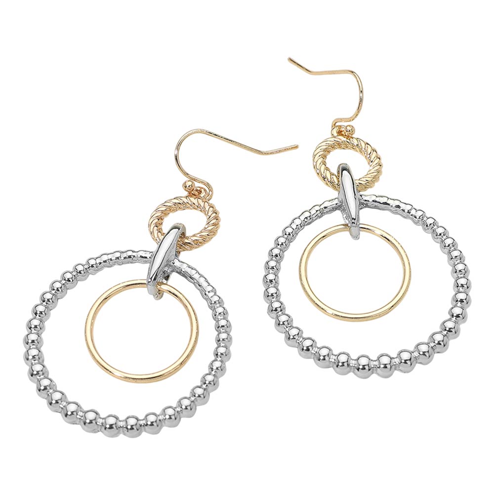 Details • Size : 1.3" X 2.25" • Fish Hook Back • Statement drop earrings featuring layered ring details with a beaded outer hoop and smooth inner circle for a modern mixed-design look. Designed to add depth and movement, these earrings elevate everyday outfits and complement casual, office, or evening styling with effortless versatility. • Lead and Nickel Compliant