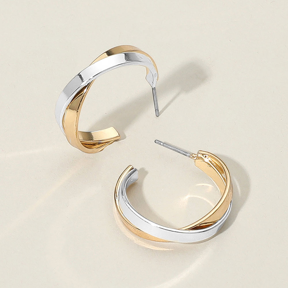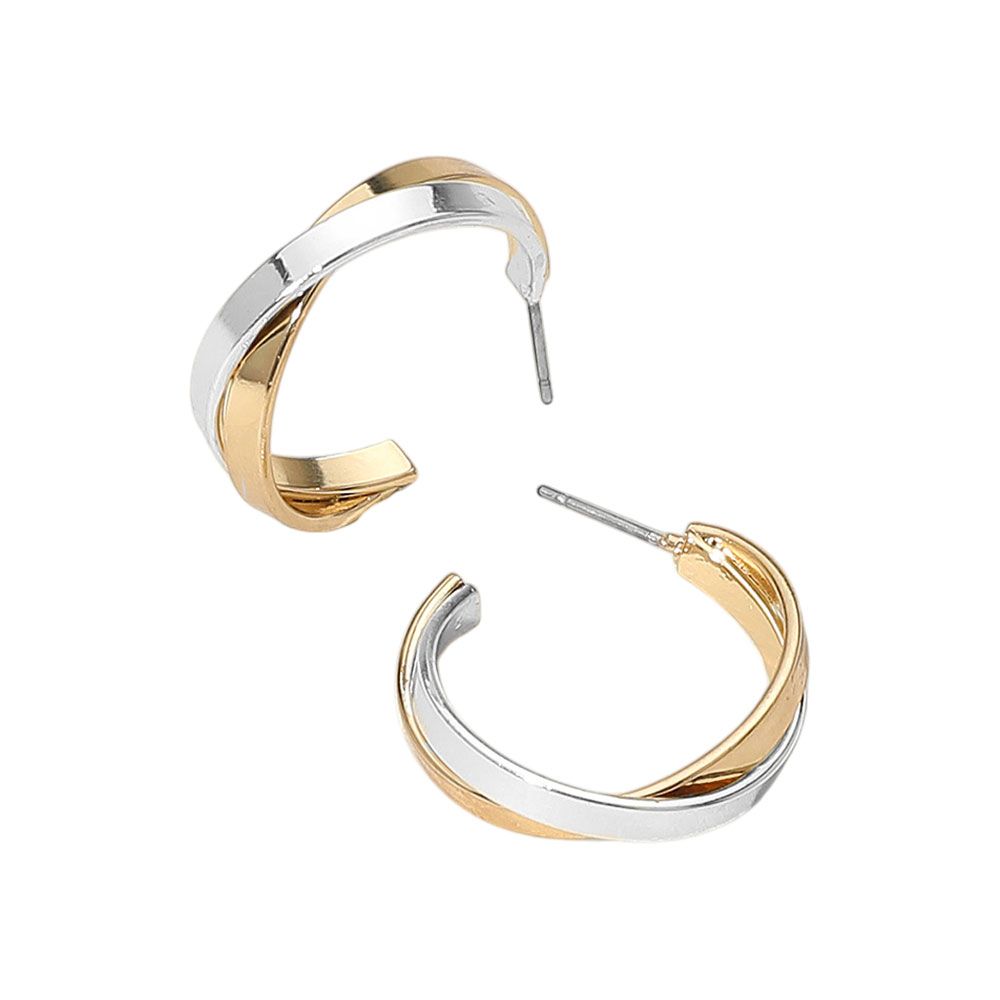 Details • Size : 1" X 1" X 0.25" • Post Back • Classic hoop earrings with a modern twist design in a two-tone finish. Lightweight and versatile, perfect for adding a polished touch to day or evening looks. Secure post backs for comfortable wear. • Lead and Nickel Compliant