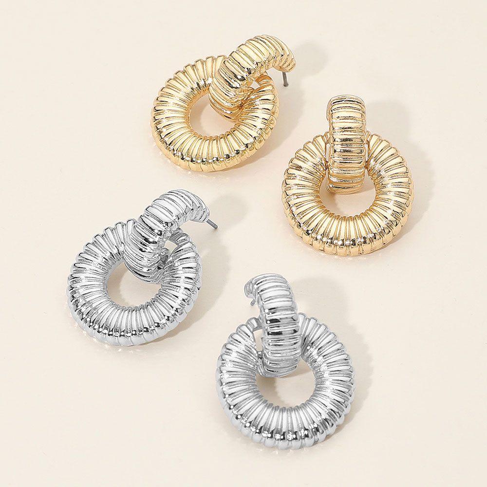 • Elevate your accessory game with these textured circle earrings. Their sculpted design and interlocking loops create a bold yet elegant statement, perfect for adding modern sophistication to both casual and dressy looks.