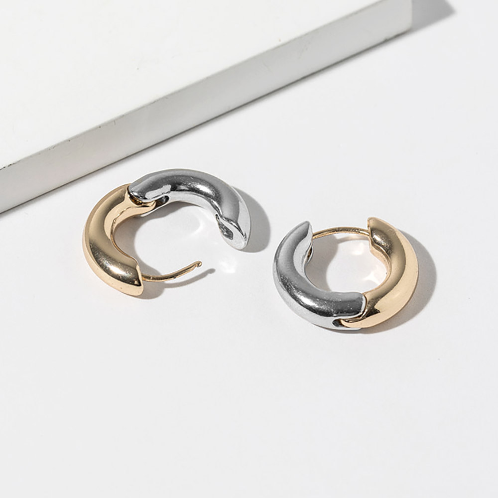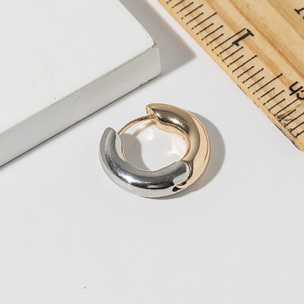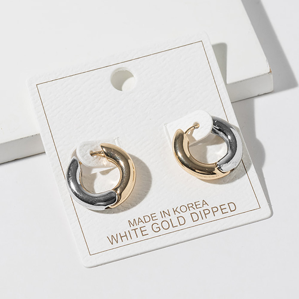 Details • Size : 0.75" X 0.75" • Huggie Back • Sleek huggie hoop earrings featuring a compact rounded silhouette with a modern dual-finish design and secure hinged closure. Ideal for everyday wear, work outfits, and minimalist styling, these versatile hoops add polished sophistication, subtle contrast, and effortless elegance to any jewelry collection. • Gold Dipped • Lead and Nickel Compliant • Made In Korea