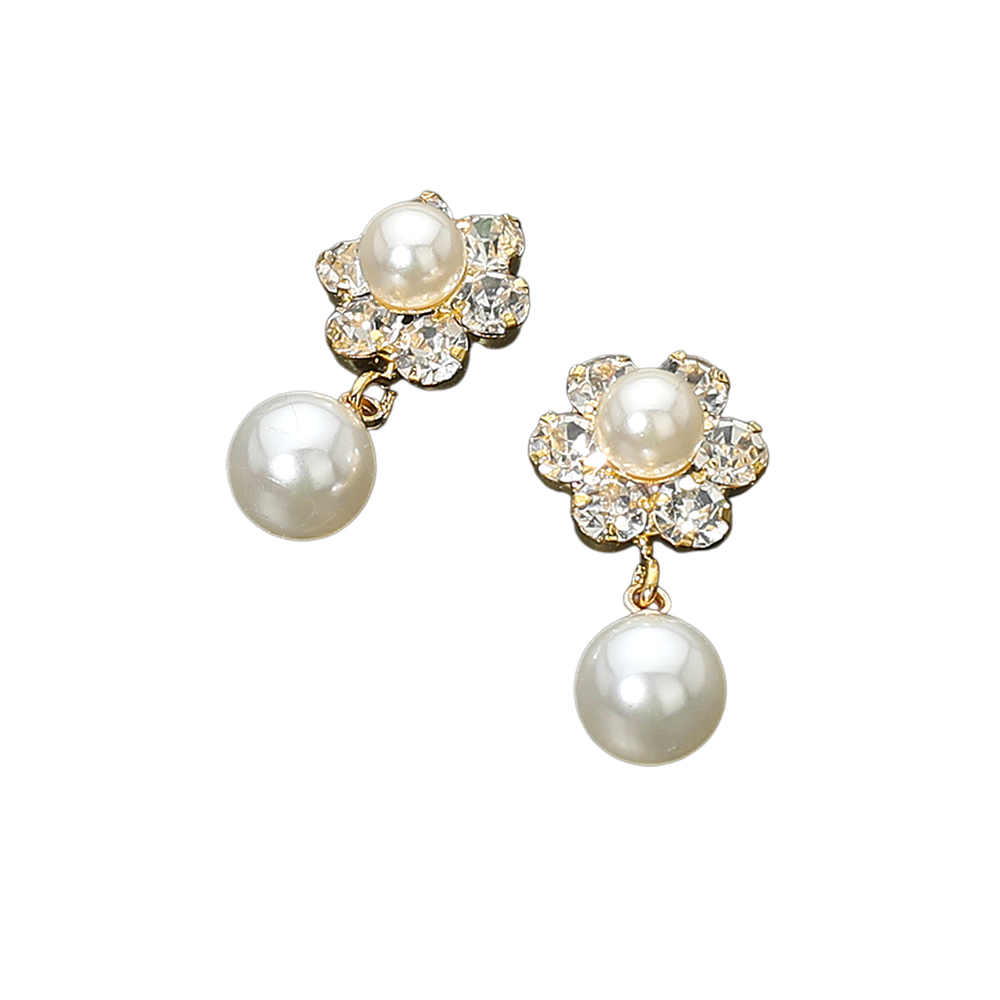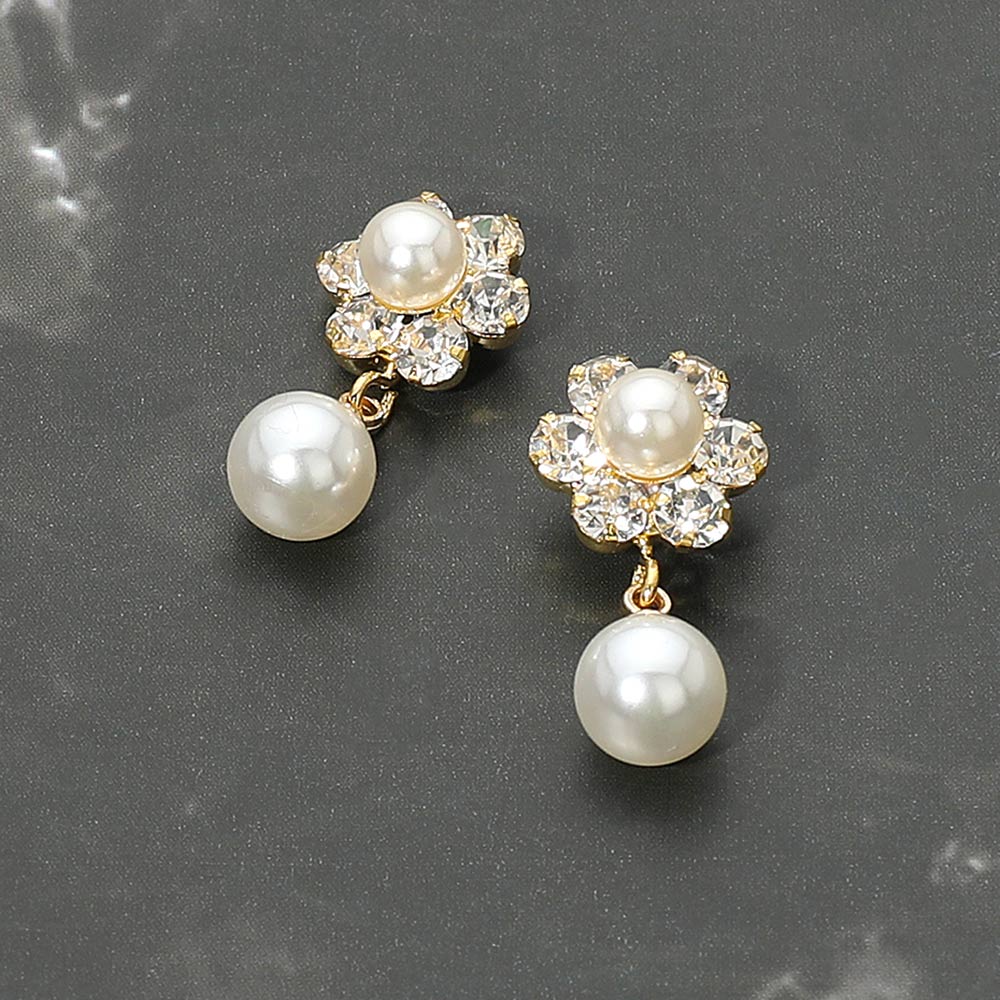 • Elegant floral pearl drop stud earrings featuring a clustered flower design accented with a smooth dangling pearl. Their timeless silhouette adds a refined, classic touch to bridal looks, formal outfits, or everyday elegance. A versatile accessory perfect for gifting and special occasions.