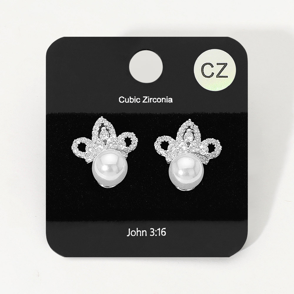 Pearl Accented CZ Embellished Crown Stud Evening Earrings