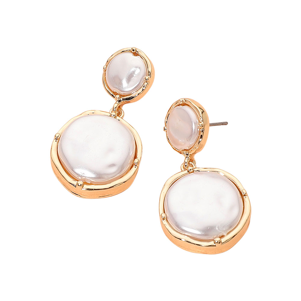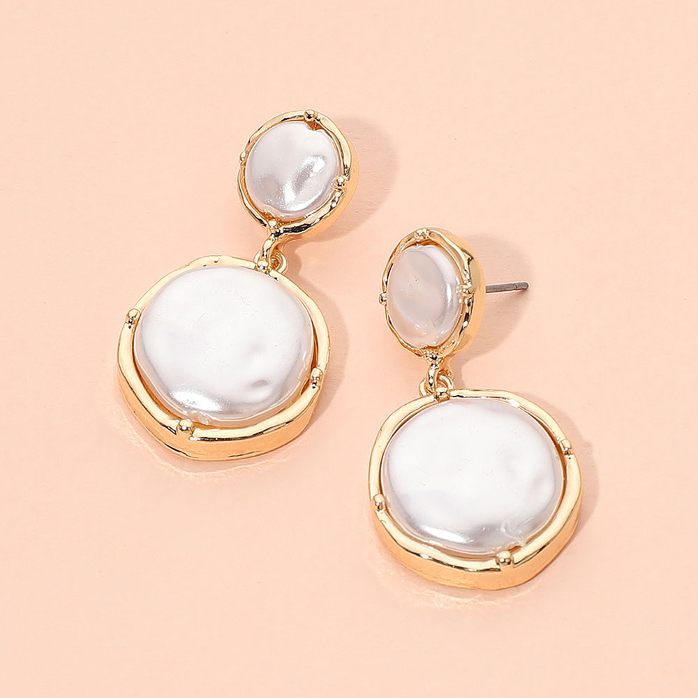 Details • Size : 0.8" X 1.6" • Post Back • Chic pearl double-disc drop earrings designed with stacked rounded accents that create soft movement and subtle shimmer. A polished statement piece that elevates casual looks and pairs effortlessly with dressy outfits for a refined, modern finishing touch. • Lead and Nickel Compliant