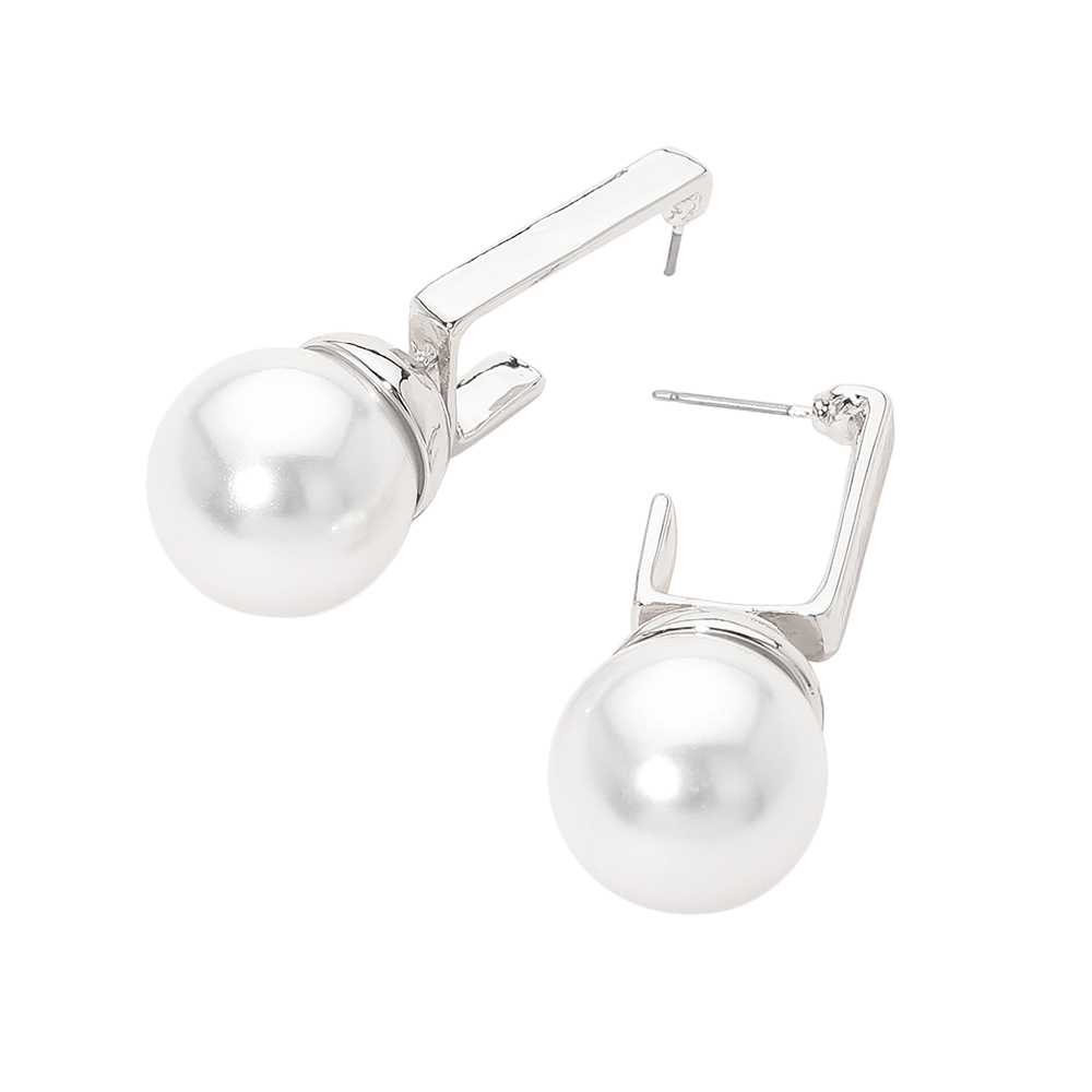 Details • Size : 0.75" X 1.8" • Post Back • These modern pearl drop earrings pair a bold spherical accent with a sleek geometric hook, creating a refined yet contemporary silhouette. Their eye-catching design adds effortless elegance to any look, making them an ideal choice for both polished daytime style and elevated evening wear. • Lead and Nickel Compliant • Hypoallergenic