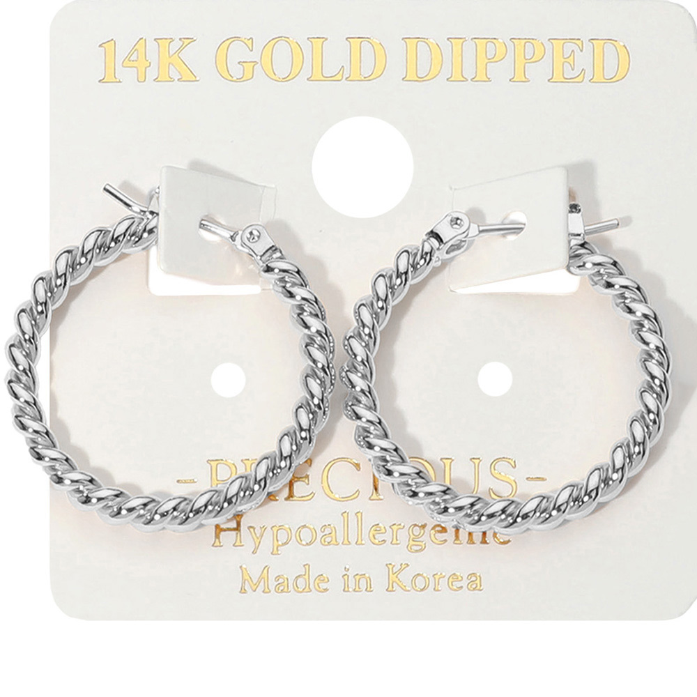 Details • Size : 1" X 1" (2.5mm) • Pin Catch • Chic twisted hoop earrings with a sleek design, perfect for elevating everyday or formal looks. Hypoallergenic and lightweight for comfortable wear. A timeless accessory that complements any style, making it a versatile addition to your jewelry collection or a thoughtful gift. • Hypoallergenic • Made In Korea • Gold Dipped