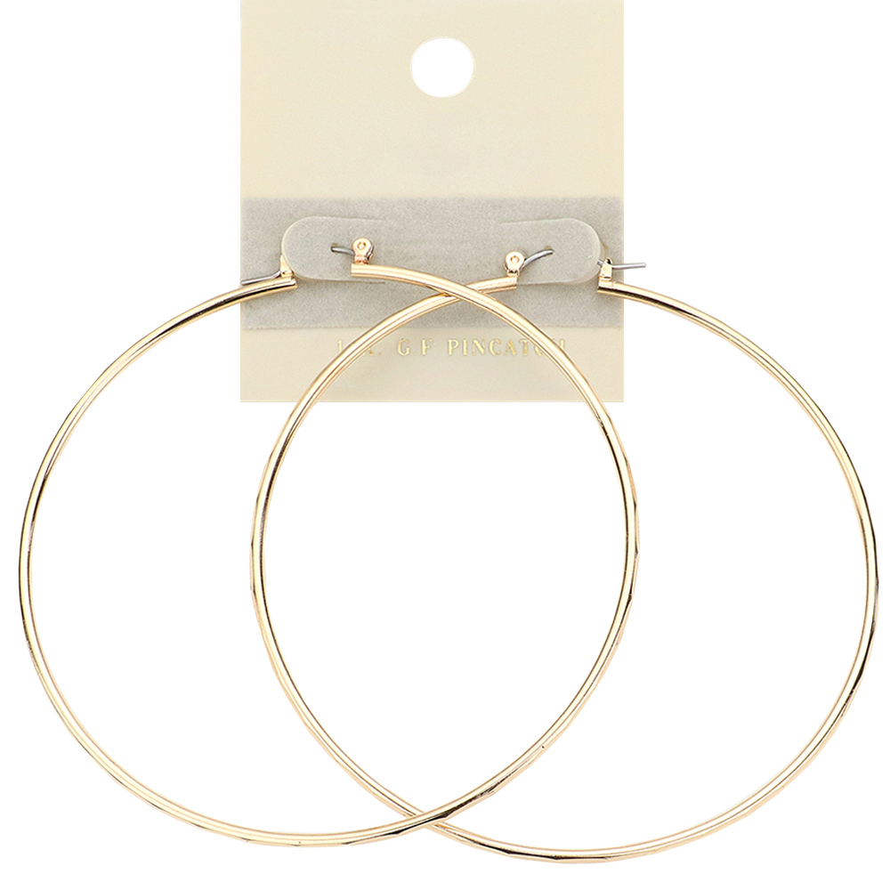 Details • Size : 3.1" X 3.1" • Pin Catch • These thin polished hoop earrings offer an elegant, streamlined look perfect for elevating any outfit. Their lightweight feel and timeless shape make them a versatile accessory for daily wear or special occasions, adding effortless shine and sophistication without overwhelming your style. • Lead and Nickel Compliant • Gold Filled