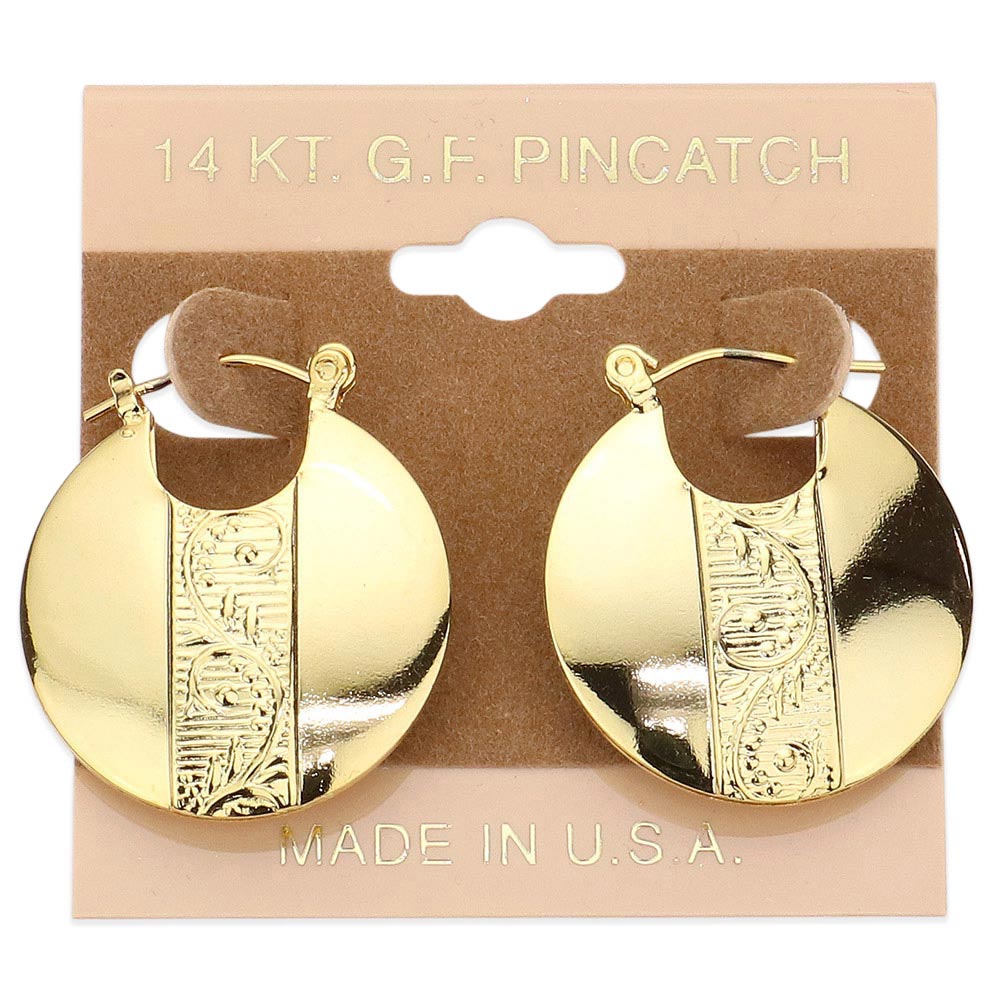 Details • Size : 1" L • Pin Catch • Made In USA • Elevate your look with these round hoop earrings featuring a polished finish and a striking vertical band of intricate raised detail. A perfect balance of sleek minimalism and artistic texture, these earrings transition seamlessly from casual to statement style. • Gold Filled