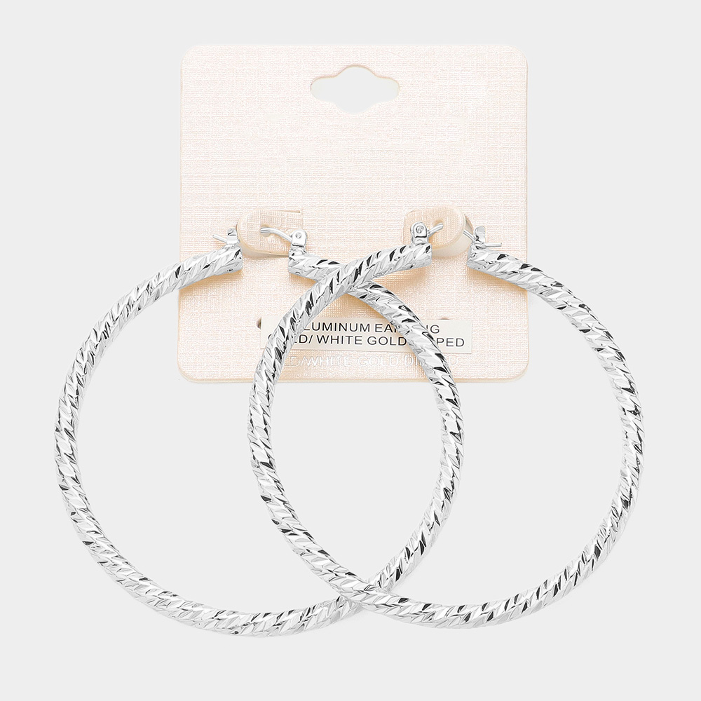 2.7" White Gold Dipped Textured Aluminum Pin Catch Hoop Earrings