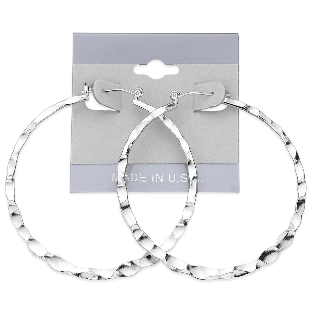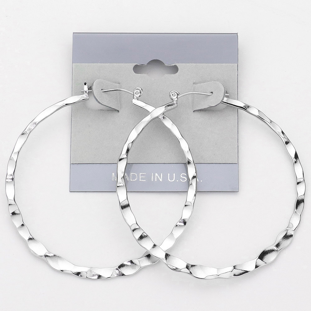 Details • Size : 2.25" L • Pin Catch • Made In USA • Elevate your style with hammered round hoop earrings featuring a textured surface and classic circular design. Their bold yet versatile look makes them the perfect accessory for both everyday outfits and special occasions, adding a touch of modern elegance and timeless appeal.