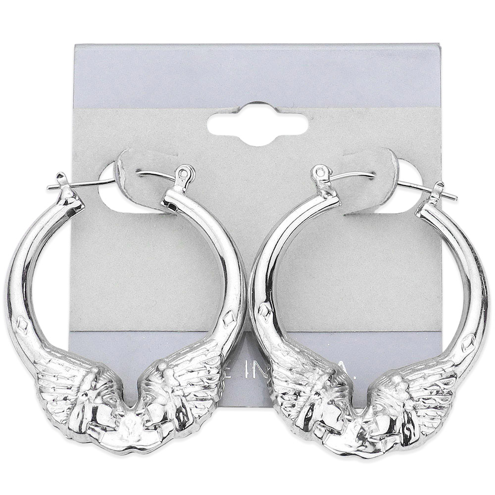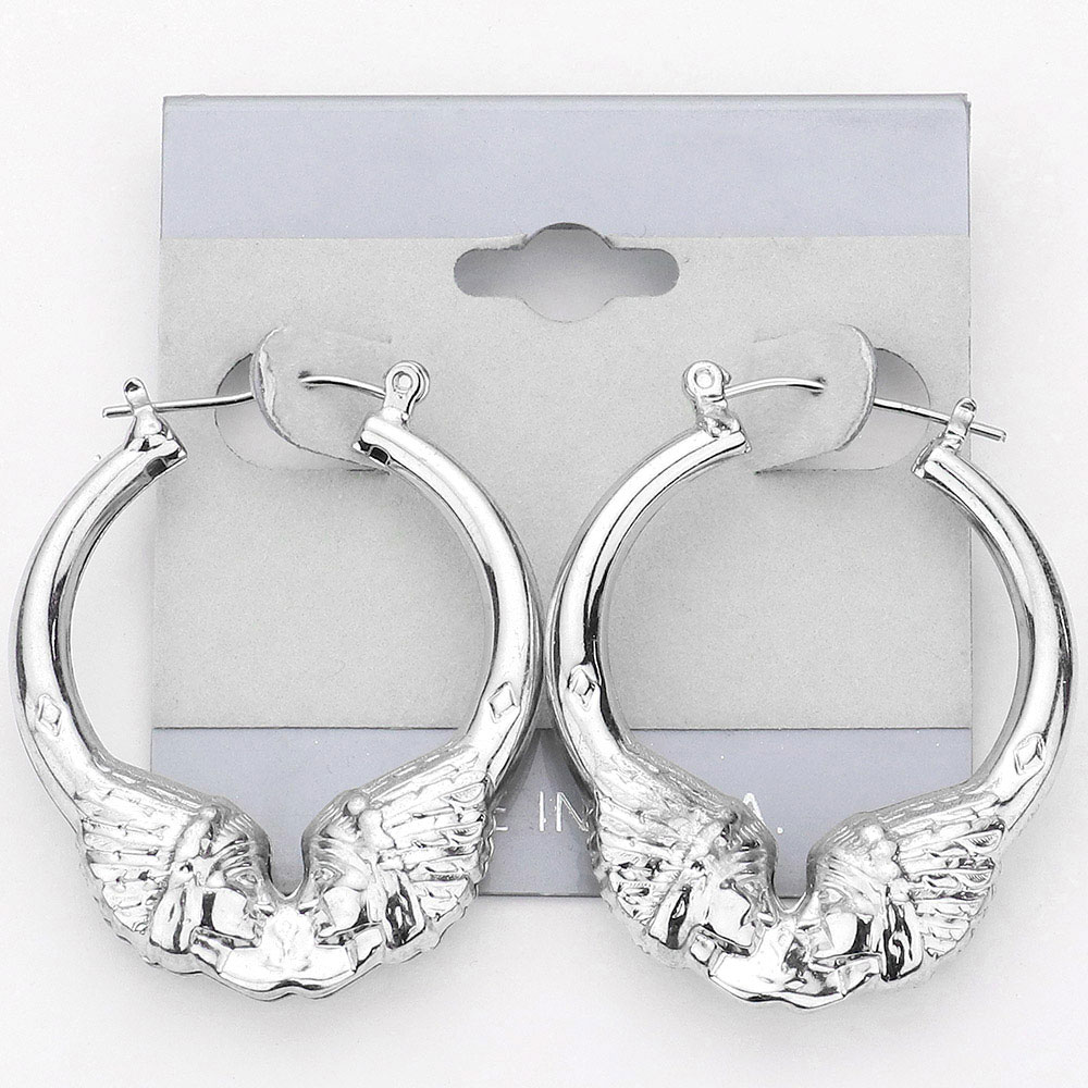 Details • Size : 1.25" X 1.6" • Pin Catch • Made In USA • Showcase bold style with Indian headdress hoop earrings, featuring intricate detailing that captures strength and tradition. Their unique sculpted design makes them a statement piece, perfect for adding personality and cultural artistry to both casual and dressy looks.