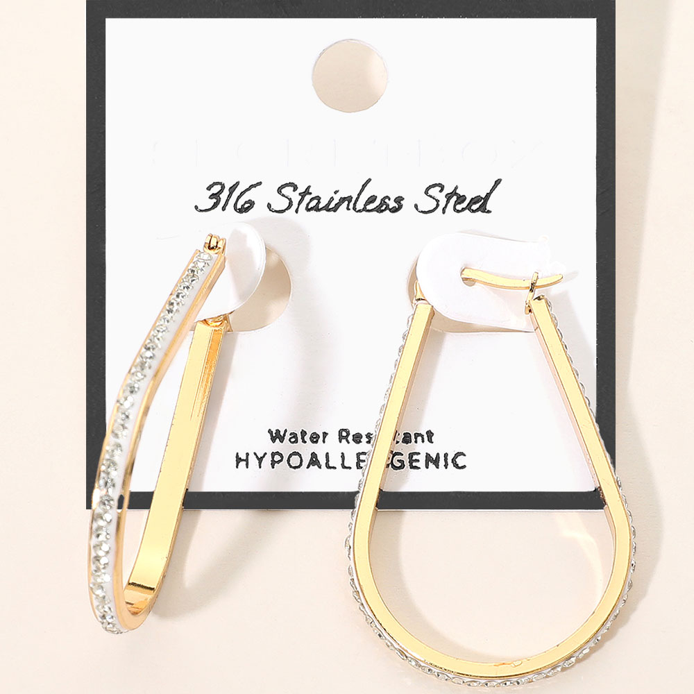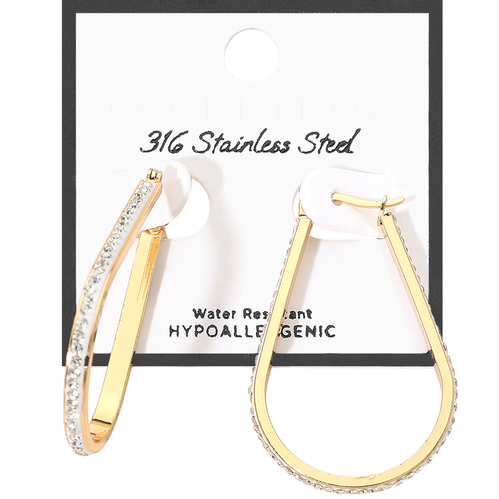 Details • Size : 1.25" X 1.8" • Pin Catch • Water Resistant • Elegant teardrop hoop earrings featuring a sleek elongated shape with shimmering embedded stones. Lightweight, hypoallergenic, and water-resistant, these stylish hoops offer a modern accent perfect for daily wear or special occasions, adding a refined touch to any jewelry collection. • Hypoallergenic • Stainless Steel