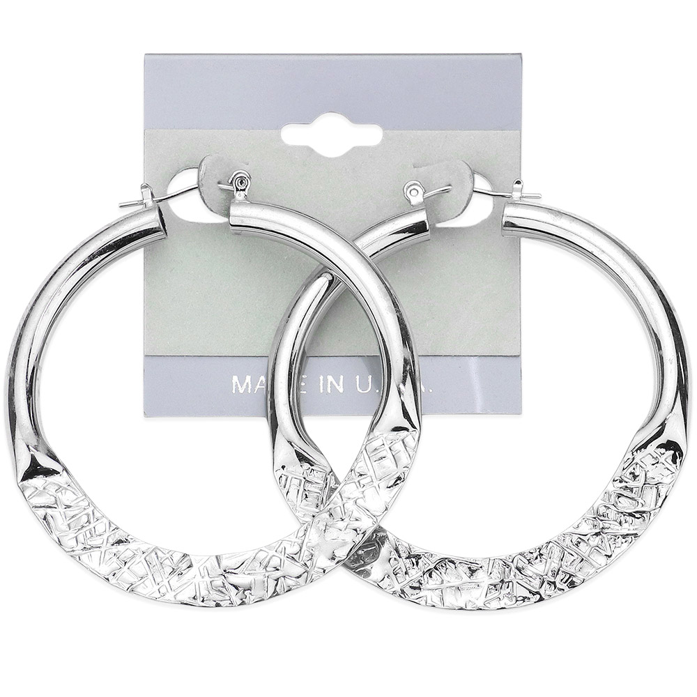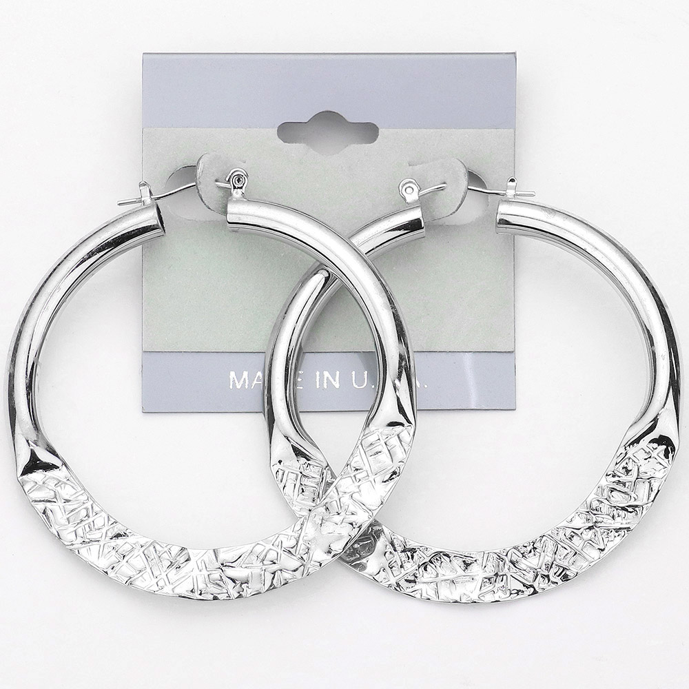 Details • Size : 2.25" L • Pin Catch • Made In USA • Add bold texture to your look with round hoop earrings featuring a unique hammered and woven-inspired surface. Their eye-catching design combines classic hoop style with modern detailing, making them a standout accessory for casual wear, evening outfits, or special events.