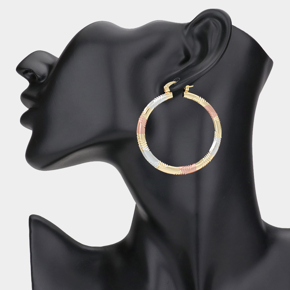 Textured Metal Three Tone Hoop Pin Catch Earrings