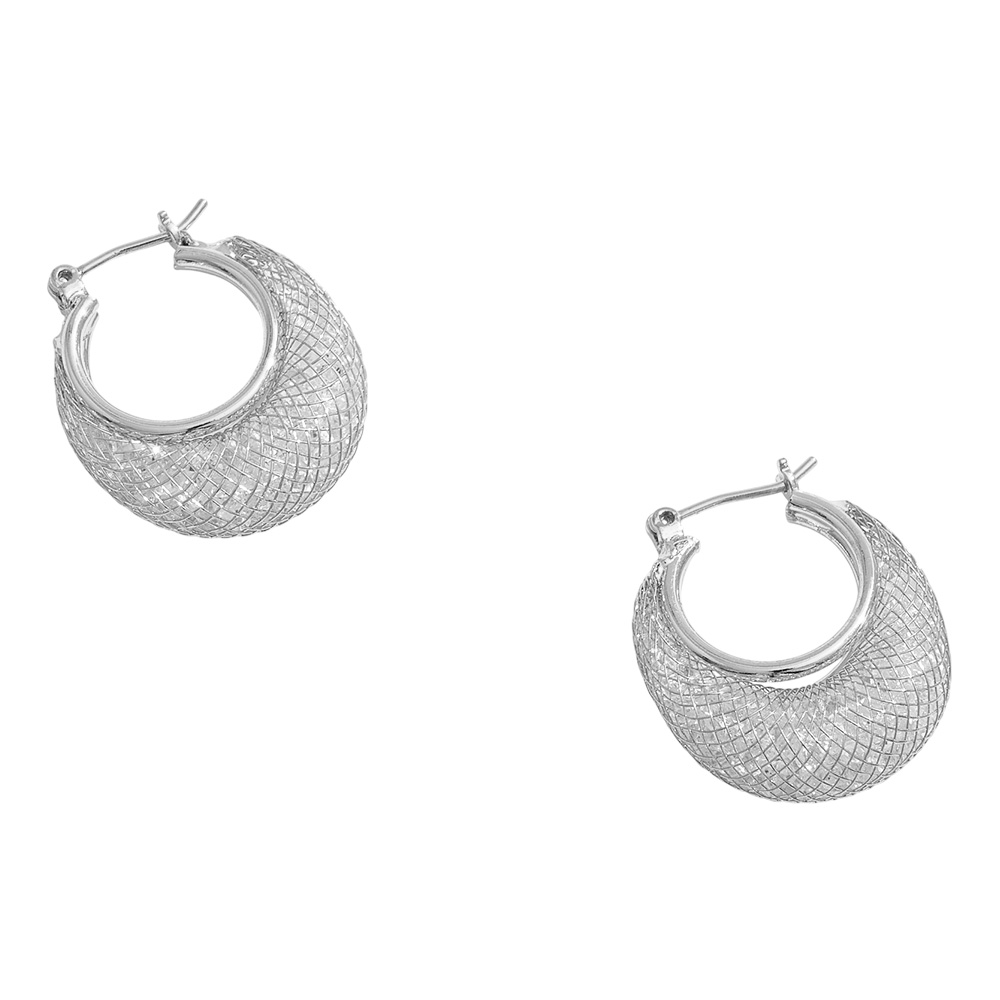 Details • Size : 1" X 1" • Pin Catch • Elevate your style with these hoop earrings featuring a unique mesh-inspired design adorned with sparkling CZ stones inside. The intricate detailing adds texture and brilliance, making them perfect for both everyday wear and special occasions with timeless elegance. • Brass • CZ Cubic Zirconia • Gold Dipped • Hypoallergenic • Lead and Nickel Compliant • Made In Korea
