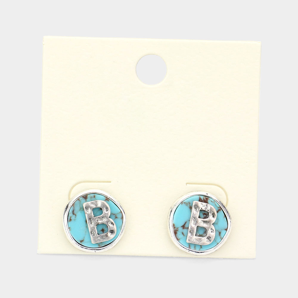 -B- Initial Monogram Turquoise Charm Faceted Beaded Stretch Bracelet