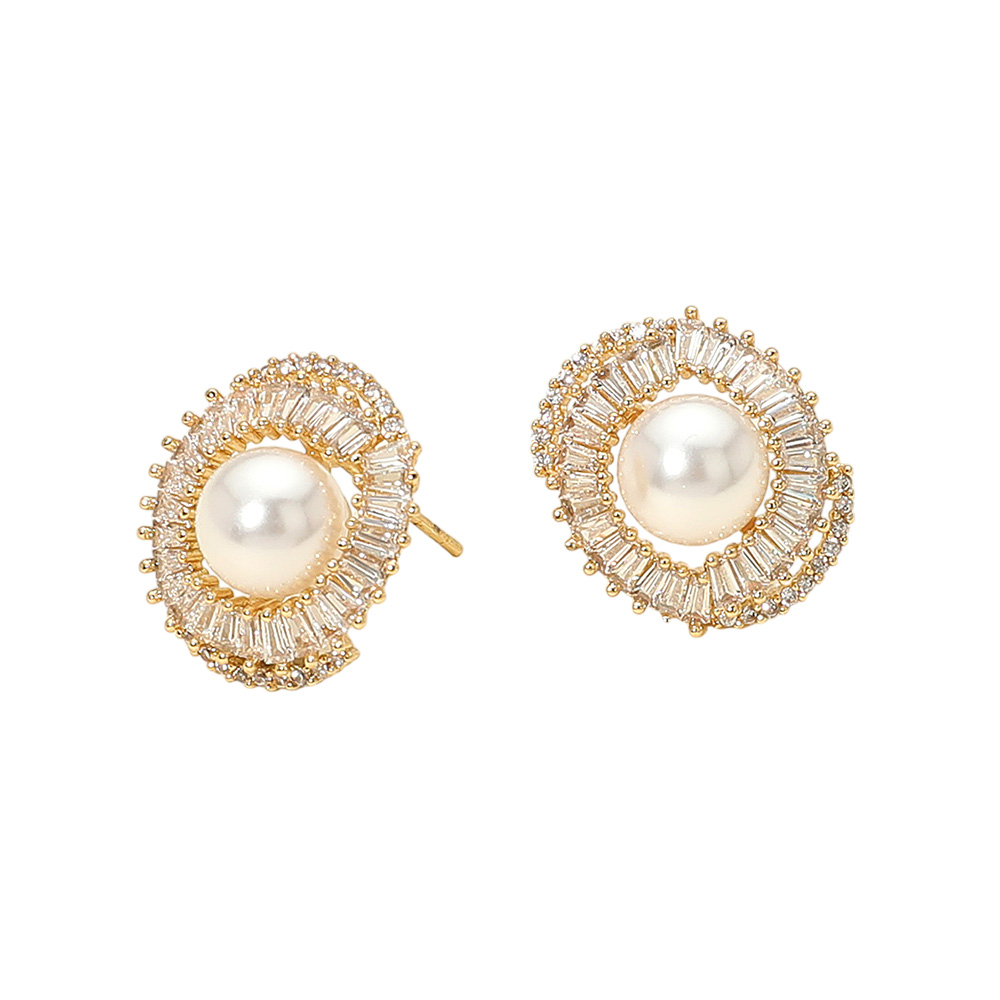 Details • Size : 0.6" X 0.7" • Post Back • Sophisticated stud earrings featuring a luminous pearl center surrounded by a radiant halo of sparkling CZ baguettes. Their timeless elegance makes them perfect for weddings, evening events, or daily sophistication, offering a refined accessory that enhances any look with classic charm. • Brass • CZ Cubic Zirconia • Gold Dipped • Hypoallergenic • Lead and Nickel Compliant • Made In Korea