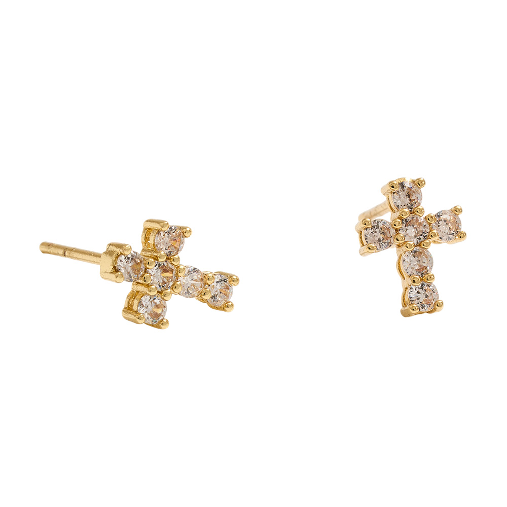 14K Gold Dipped CZ Stone Cross Mini Stud Earrings
