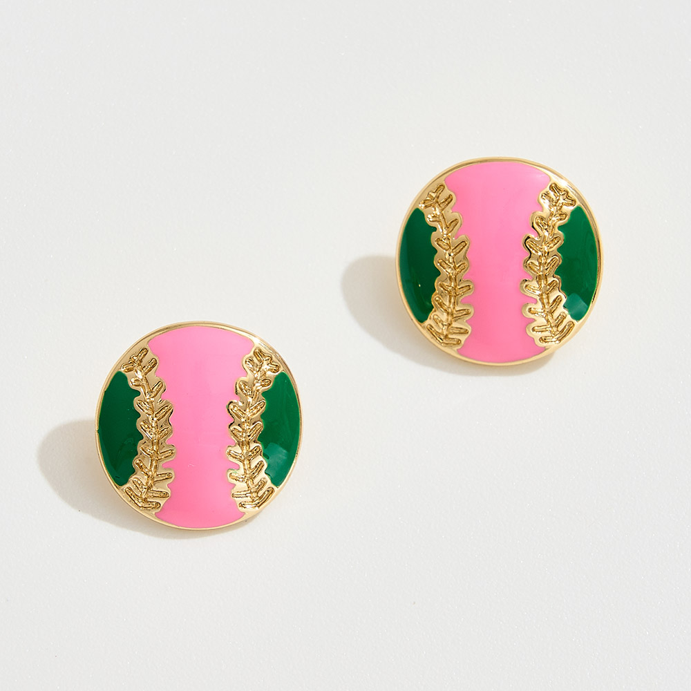 Details • Size : 0.7" X 0.7" • Post Back • Fun and sporty, these baseball shape enamel stud earrings feature a bold two-tone design accented with raised stitch-like detailing. Their unique style blends playful charm with everyday wearability, making them a standout piece for casual or statement looks. • Brass • Gold Dipped • Hypoallergenic • Lead and Nickel Compliant • Made In Korea