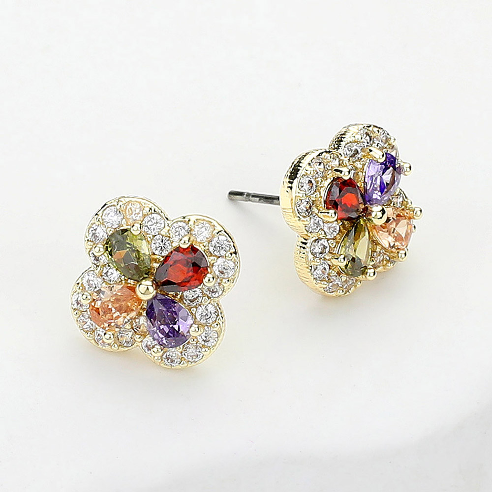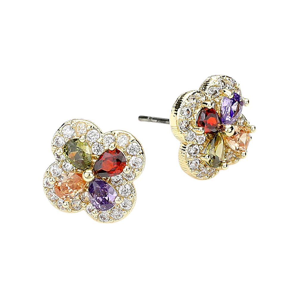 14K Gold Plated Colorful CZ Stone Embellished Quatrefoil Stud Earrings