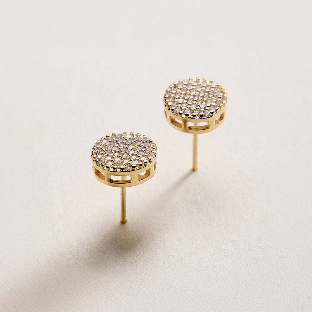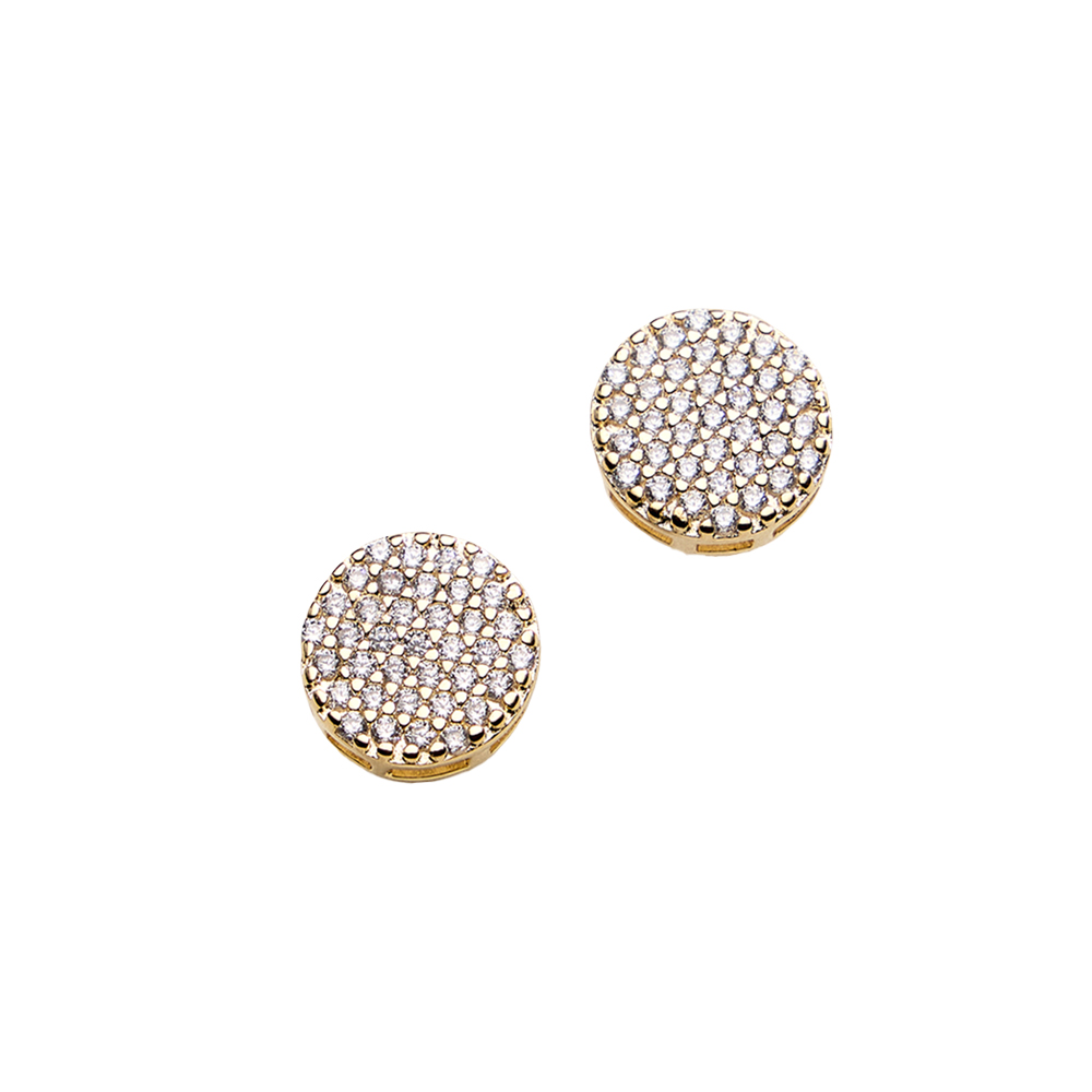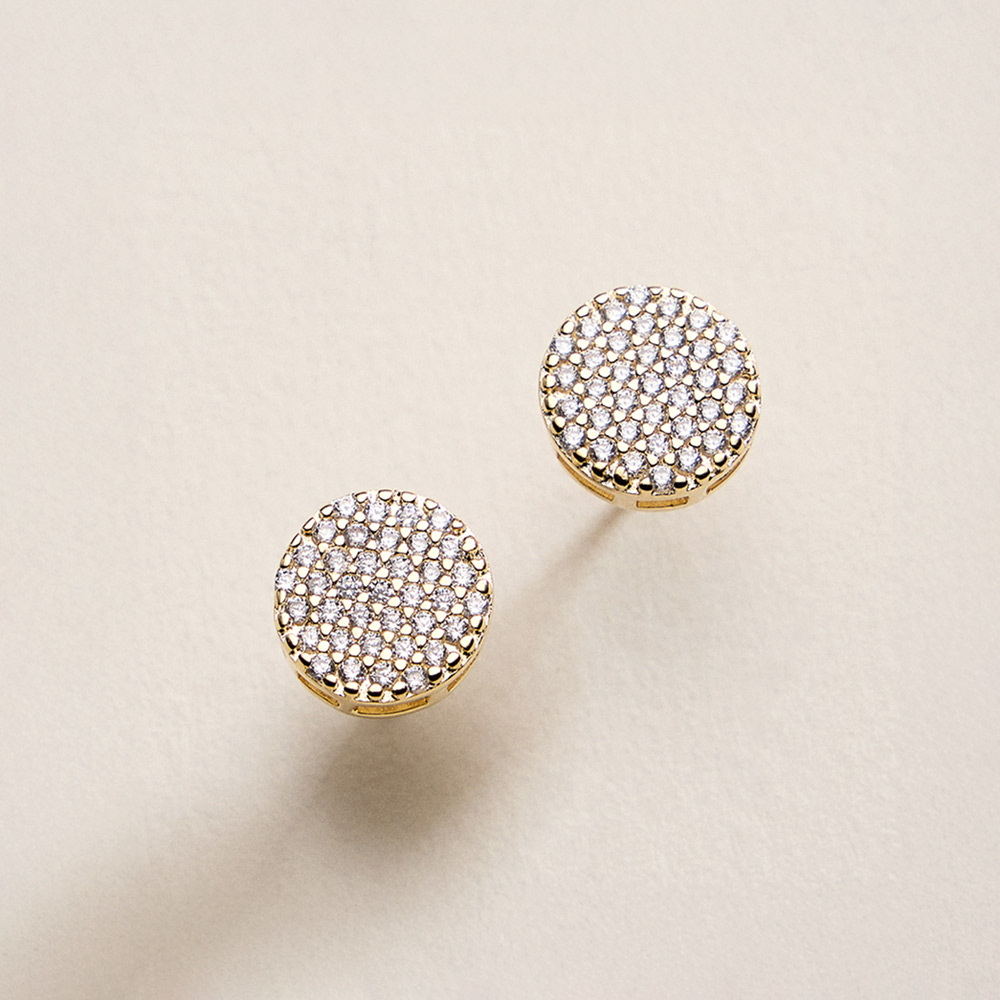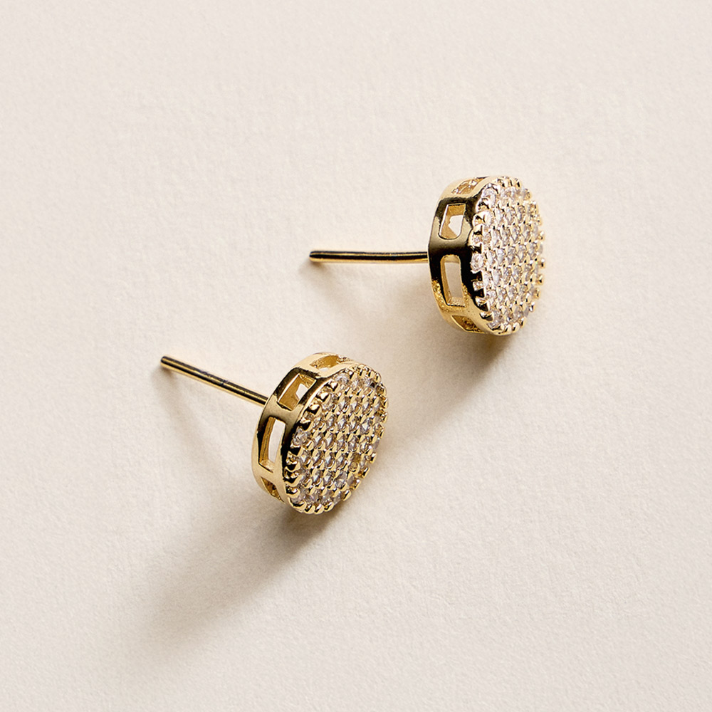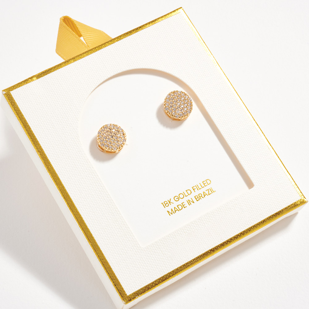 Details • Size : 0.4" X 0.4" • Post Back • Classic round stud earrings featuring a pave-style arrangement of cubic zirconia that delivers refined sparkle and balanced shine. A versatile accessory suited for daily wear, work outfits, or special occasions, offering a clean, polished look that layers effortlessly with other jewelry. • CZ Cubic Zirconia • Gold Filled • Hypoallergenic • Lead and Nickel Compliant • Made In Brazil