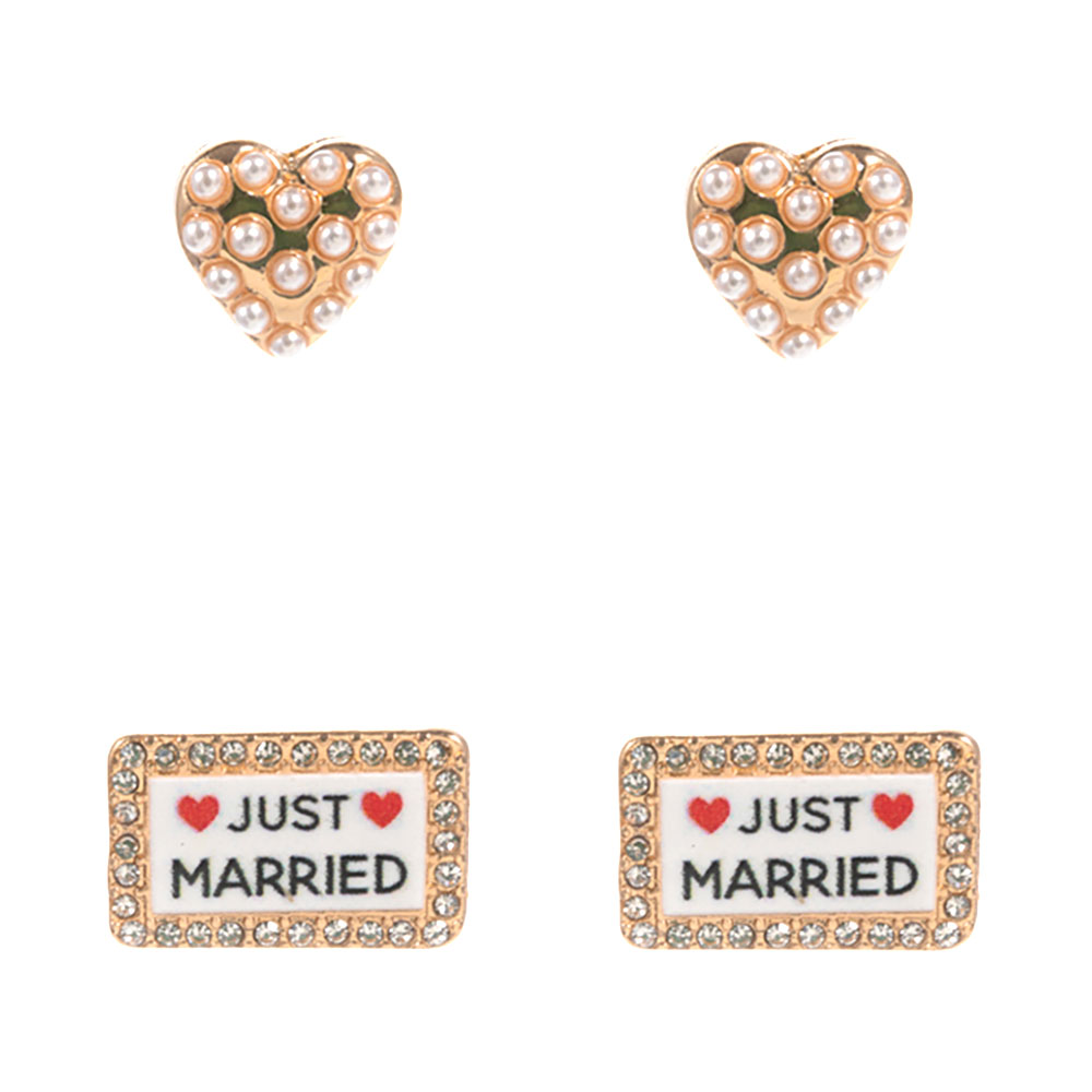Details • Size : 0.4" - 0.5" L • Titanium Post Back • Wedding-themed stud earrings featuring heart accents and “Just Married” sign designs for a playful yet elegant bridal look. Ideal for brides, bachelorette parties, bridal showers, honeymoon outfits, and wedding photo moments. A charming accessory that adds celebration, romance, and gift-ready appeal to bridal and event-focused collections. • Hypoallergenic • Lead and Nickel Compliant