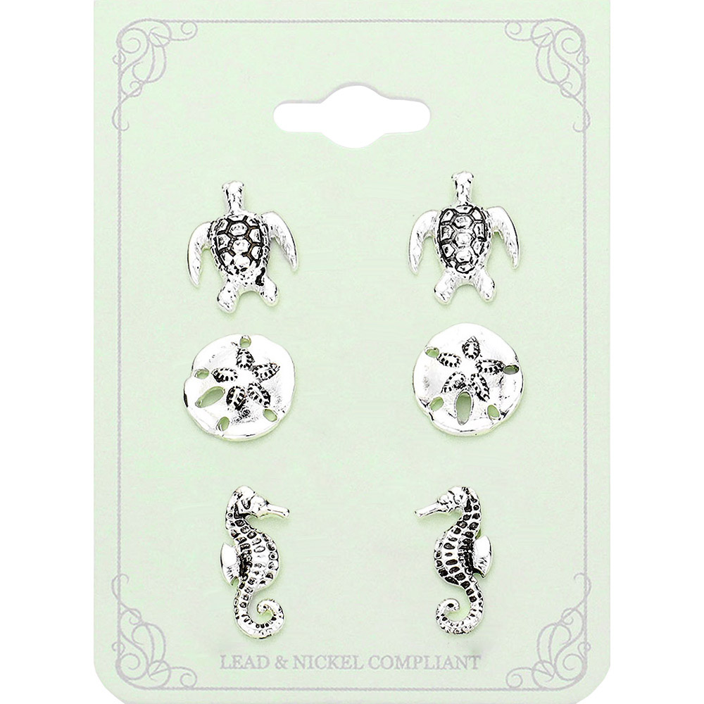 3Pairs - Antique Metal Turtle Sand Dollar Seahorse Stud Earrings