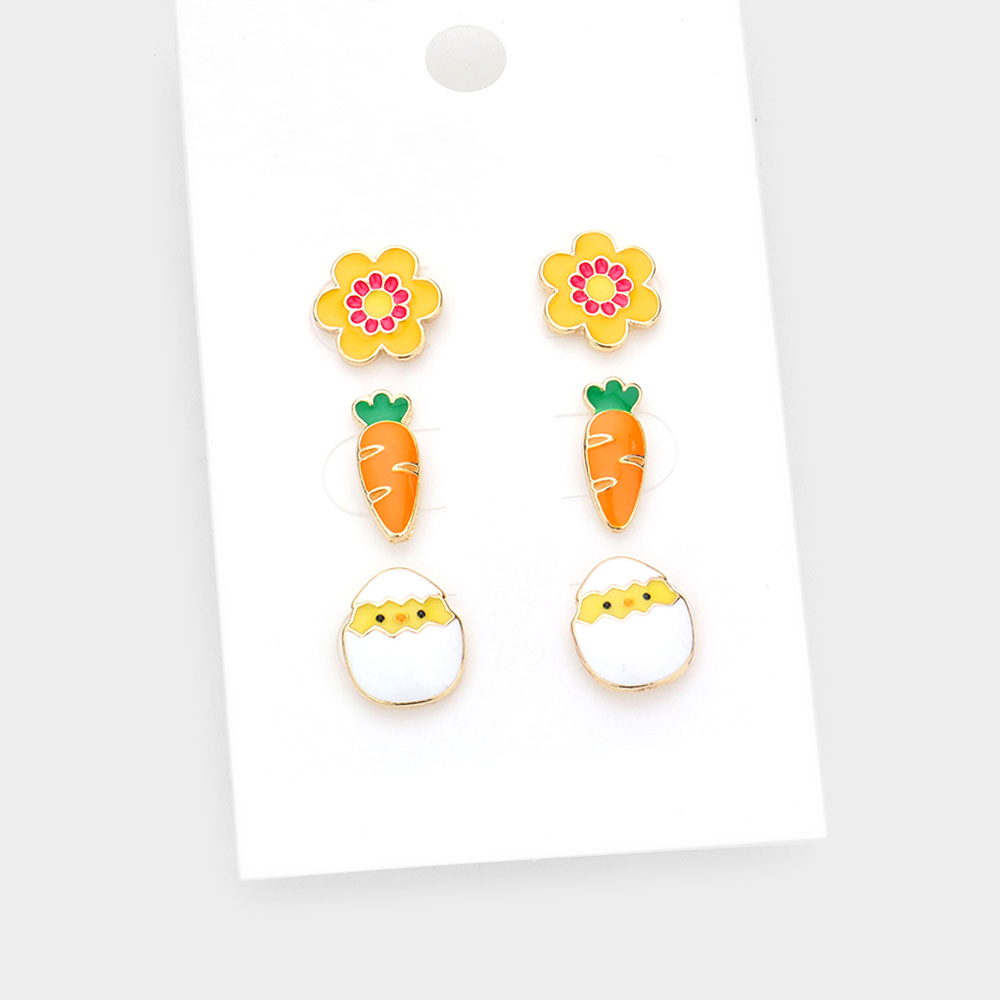 3Pairs - Enamel Flower Carrot Easter Egg Stud Earrings