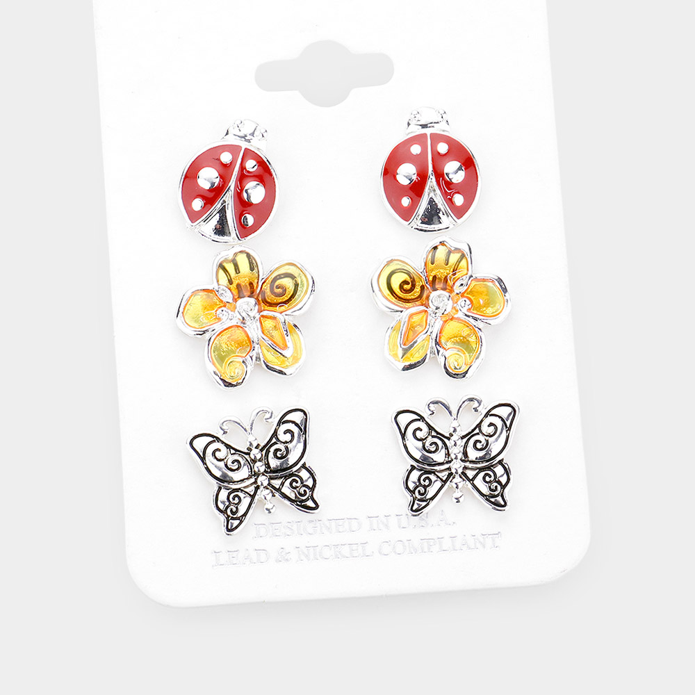 3Pairs - Enamel Ladybug Flower Metal Butterfly Stud Earrings