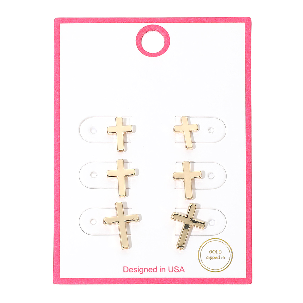 Details • Size : 0.4" - 0.6" L • Post Back • Cross stud earring set featuring multiple pairs designed for simple daily wear and easy coordination. Ideal for faith inspired looks, gifting occasions, seasonal displays, and boutique accessory collections. A versatile stud set perfect for stacking, mixing, or wearing individually for clean, meaningful style. • Gold Dipped • Lead and Nickel Compliant