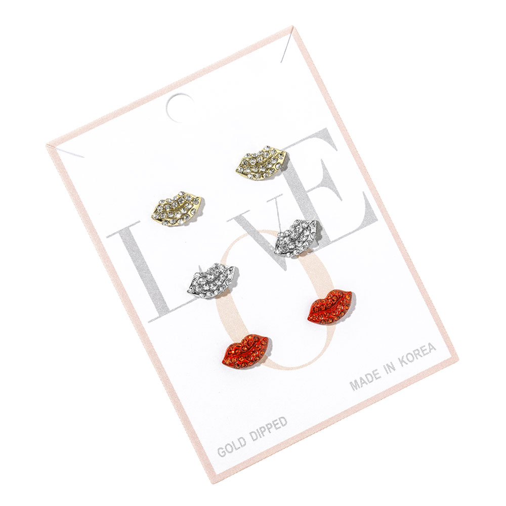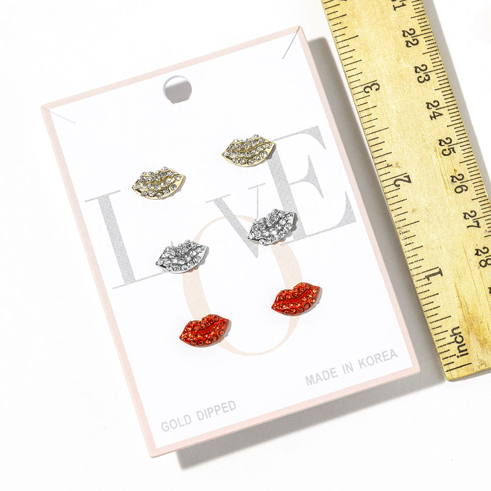 Details • Size : 0.3" L • Post Back • Lip stud earring trio set designed for playful mix and match styling. Features three coordinating lip shaped stud designs that add a bold, flirty accent to everyday looks. Ideal for multiple piercings, gifting, or trend focused displays, offering a fun statement piece for curated accessory collections and seasonal fashion edits. • Gold Dipped • Lead and Nickel Compliant • Made In Korea