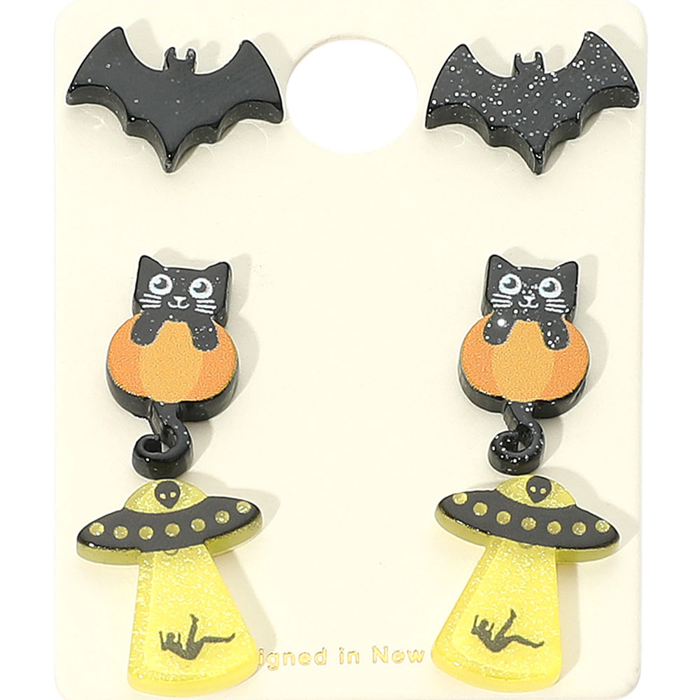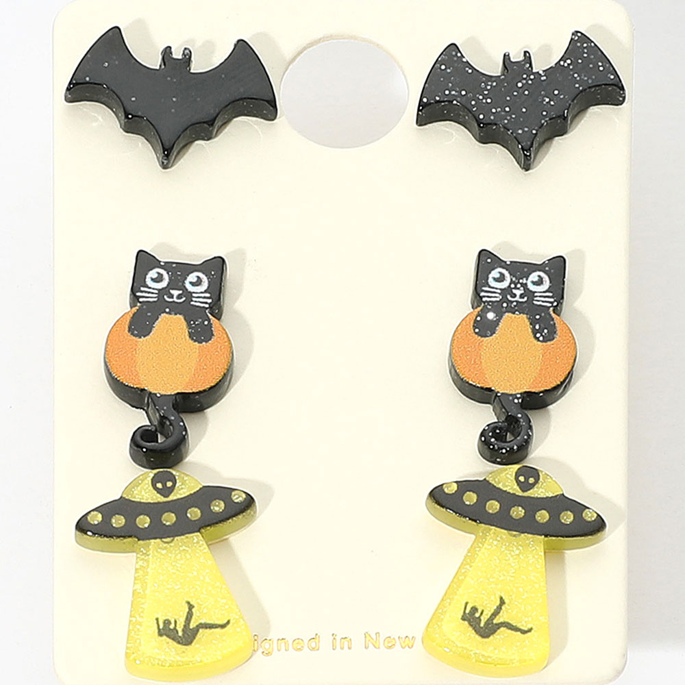 Details • Size : 0.4" - 0.6" L • Post Back • Playful Halloween earring set featuring bat studs, cat-in-pumpkin dangles, and UFO drop designs. A fun and quirky accessory combo perfect for festive looks, costume parties, or adding personality to seasonal styles. • Lead and Nickel Compliant
