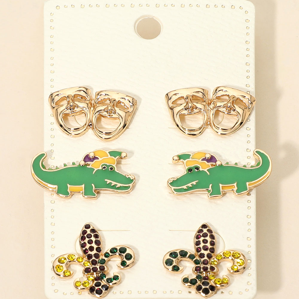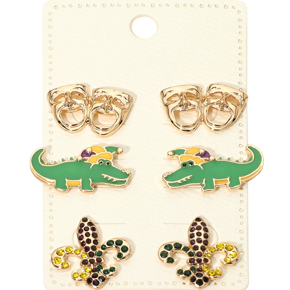 3Pairs - Mardi Gras Mask Crocodile Fleur de Lis Stud Earring Set
